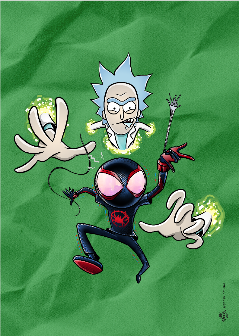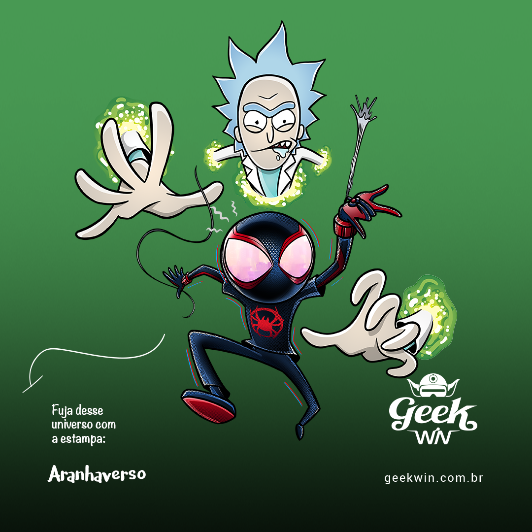 Explore o caos hilariante do multiverso com nossa estampa 'Aranhaverso'. Nesse crossover épico, Rick, da famosa série Rick and Morty, assume o papel do vilão que cria buracos dimensionais, enquanto Morty se transforma no nosso querido Homem Aranha, com uma pegada Miles Morales. A estampa captura a essência única de Rick e Morty, com Rick se tornando uma entidade multiversal gigante, tentando capturar Morty Aranha em uma dança caótica entre portais dimensionais. Mergulhe nesse universo divertido e vibrante que mistura o melhor de ambos os mundos, com traços inspirados na estética de Rick and Morty.