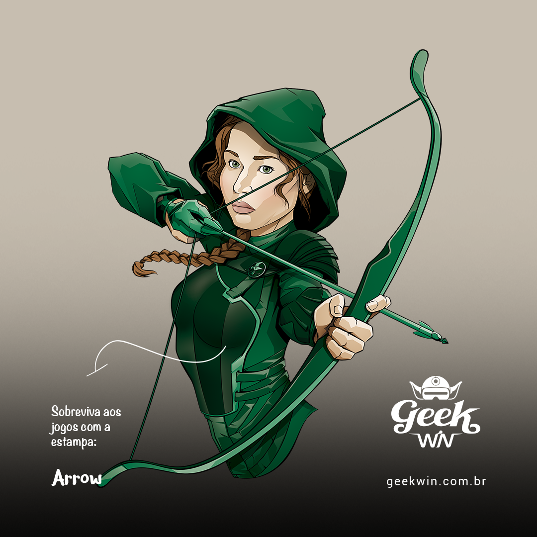 Prepare-se para uma fusão única e emocionante com a estampa 'Arrow' da Geek Win. Esta criação exclusiva traz o melhor de dois mundos, unindo o icônico Arqueiro Verde, também conhecido como Oliver Queen dos quadrinhos do Universo DC, com a destemida Katniss Everdeen da franquia 'Jogos Vorazes'. Ambos são mestres no uso do arco e flecha, e nesta estampa, eles se encontram em uma cena épica. Katniss, tradicionalmente vestida de vermelho, assume uma reviravolta verde com o icônico capuz do Arqueiro Verde, enquanto aponta seu arco e flecha com determinação. Esta criação criativa celebra a paixão por dois heróis arqueiros em um crossover que é um verdadeiro tesouro para os fãs da cultura geek. Adicione um toque de aventura e estilo à sua coleção com a estampa 'Arrow' da Geek Win.