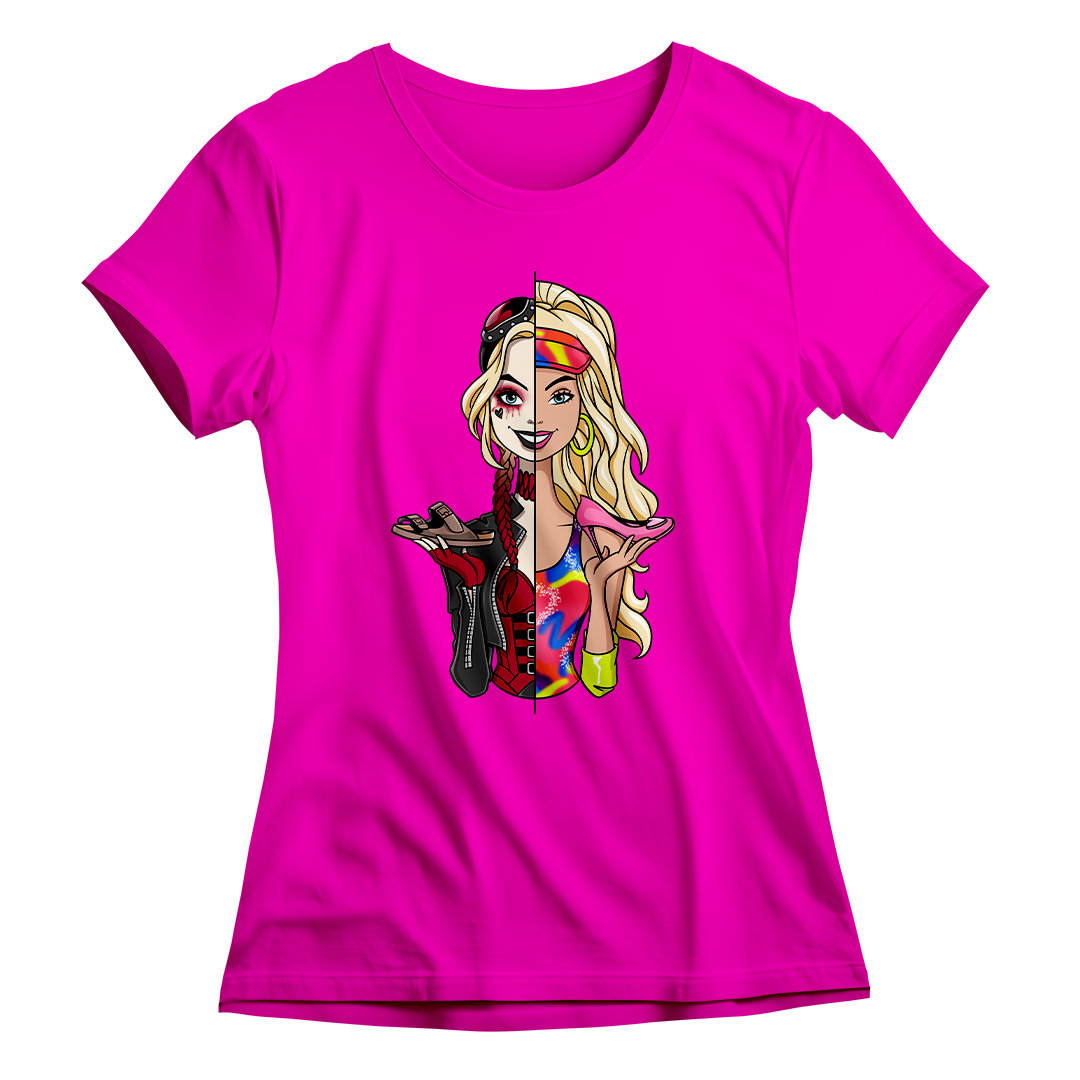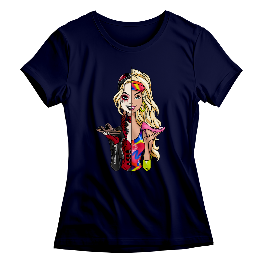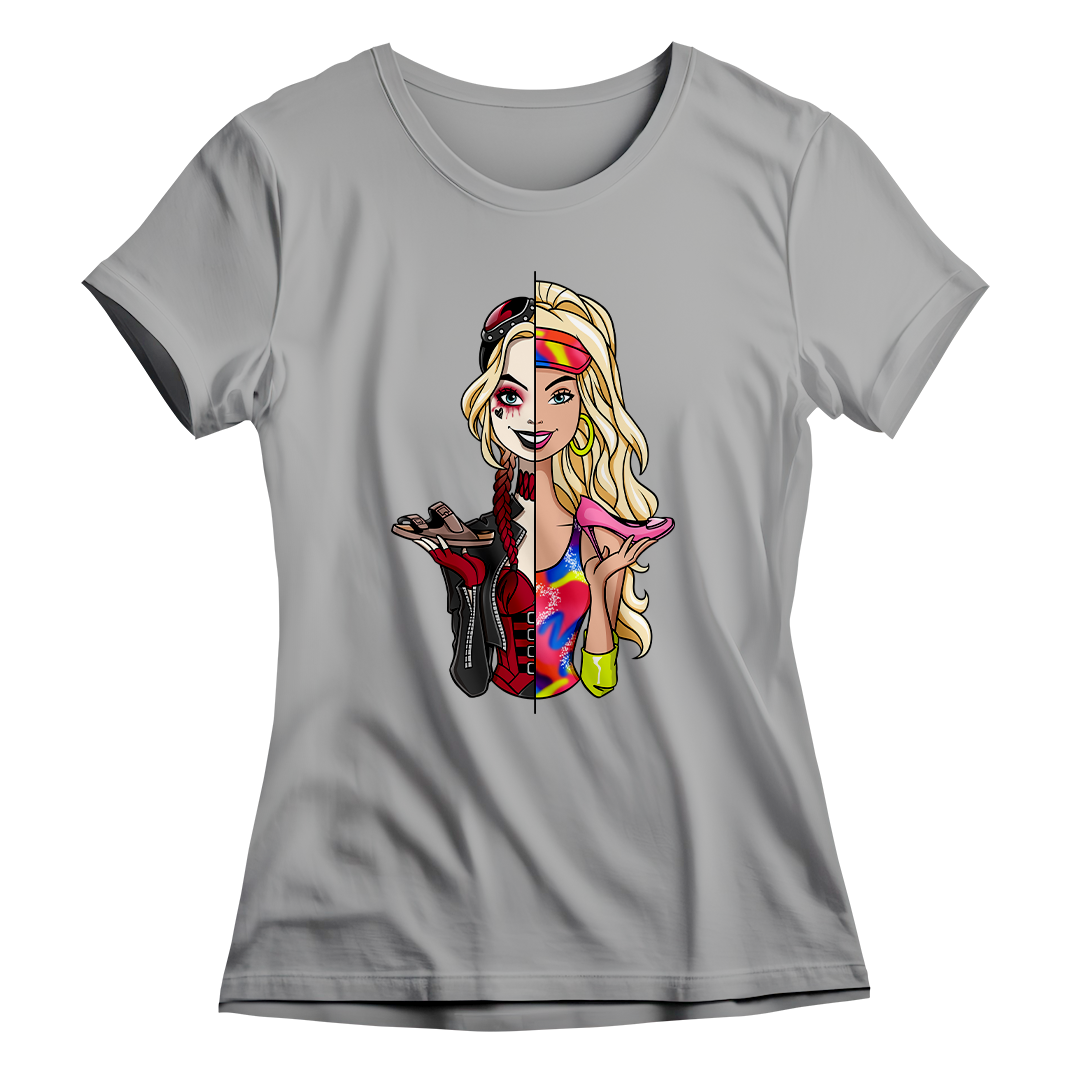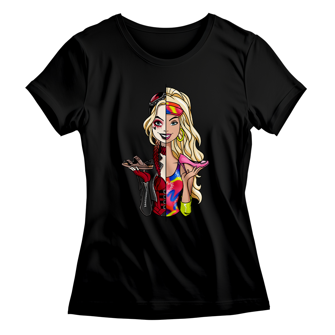 Explore o universo de dualidades com nossa estampa exclusiva "Barbie Quinn" da Geek Win! Esta fusão única entre a icônica Barbie e a audaciosa Harley Quinn, ambas interpretadas pela talentosa Margot Robbie, é uma jornada visual entre dois extremos. Divididas por uma linha vertical, Barbie e Quinn seguram calçados que simbolizam suas realidades. O salto elegante da Barbie, rosa e impecável, representa o mundo dos sonhos, enquanto a sandália caótica da Quinn revela a crueza da vida real. Uma metáfora entre a pílula azul e vermelha de Matrix, esta estampa celebra a dualidade feminina e a complexidade de escolhas, onde a moda e a reflexão se encontram e transcende o imaginário. Mergulhe nesse crossover inusitado que transcende o imaginário. #BarbieQuinn #Crossover #DualidadeFashion
