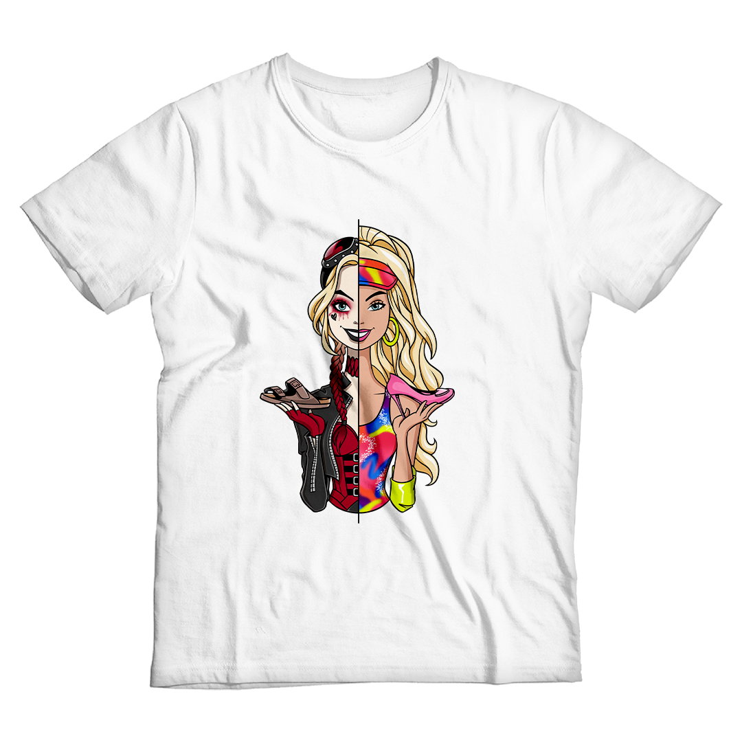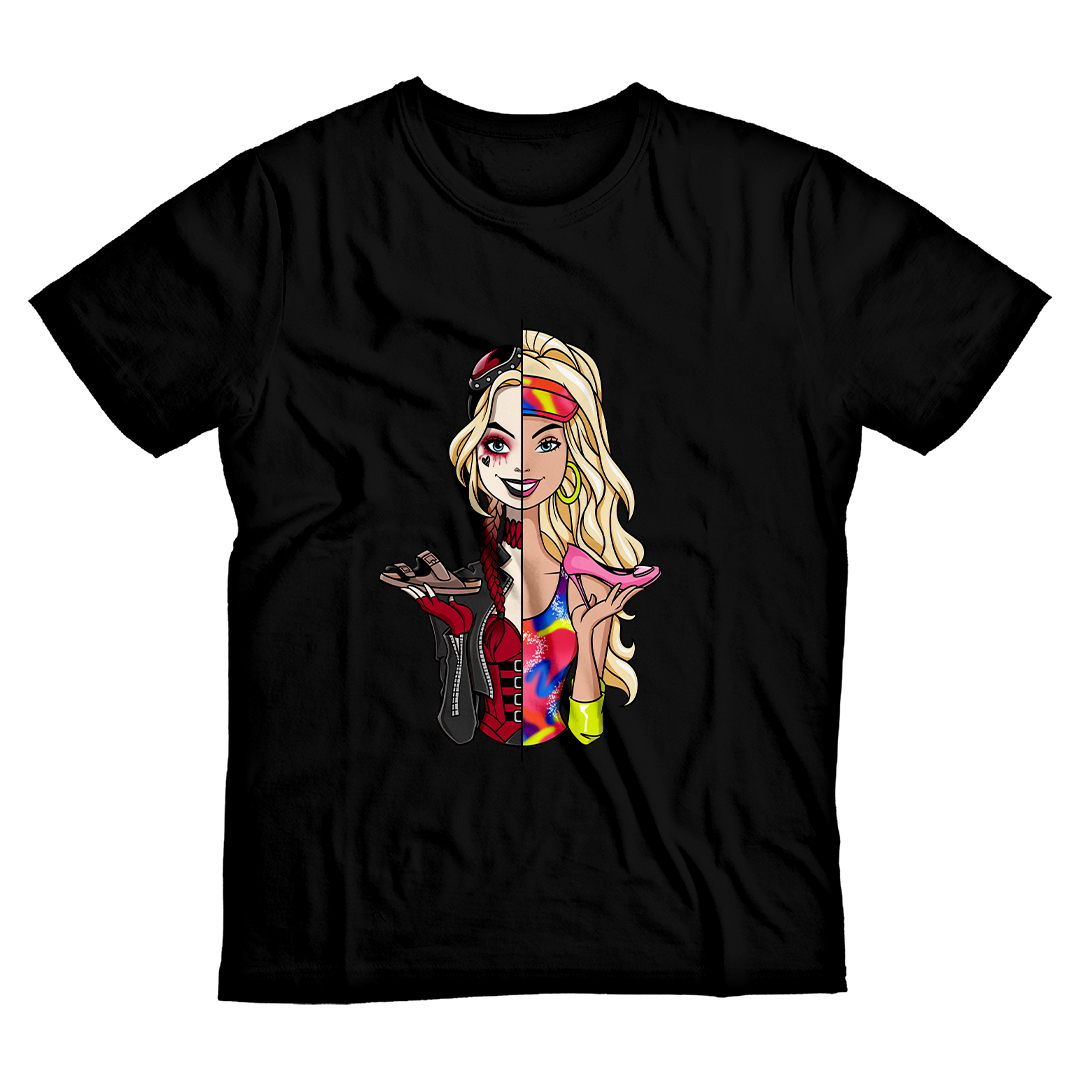 Explore o universo de dualidades com nossa estampa exclusiva "Barbie Quinn" da Geek Win! Esta fusão única entre a icônica Barbie e a audaciosa Harley Quinn, ambas interpretadas pela talentosa Margot Robbie, é uma jornada visual entre dois extremos. Divididas por uma linha vertical, Barbie e Quinn seguram calçados que simbolizam suas realidades. O salto elegante da Barbie, rosa e impecável, representa o mundo dos sonhos, enquanto a sandália caótica da Quinn revela a crueza da vida real. Uma metáfora entre a pílula azul e vermelha de Matrix, esta estampa celebra a dualidade feminina e a complexidade de escolhas, onde a moda e a reflexão se encontram e transcende o imaginário. Mergulhe nesse crossover inusitado que transcende o imaginário. #BarbieQuinn #Crossover #DualidadeFashion