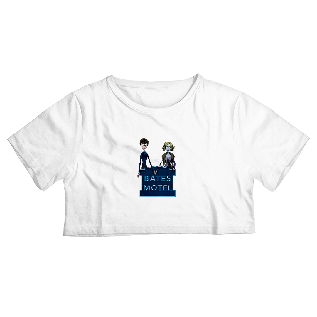 A fachada do hotel traz o icônico lettering "Bates Motel", transformando esta estampa em um verdadeiro crossover cinematográfico com uma pitada de animação peculiar. Vista o inesperado com esta estampa exclusiva que transcende fronteiras entre o terror clássico e o encanto sombrio de Tim Burton.