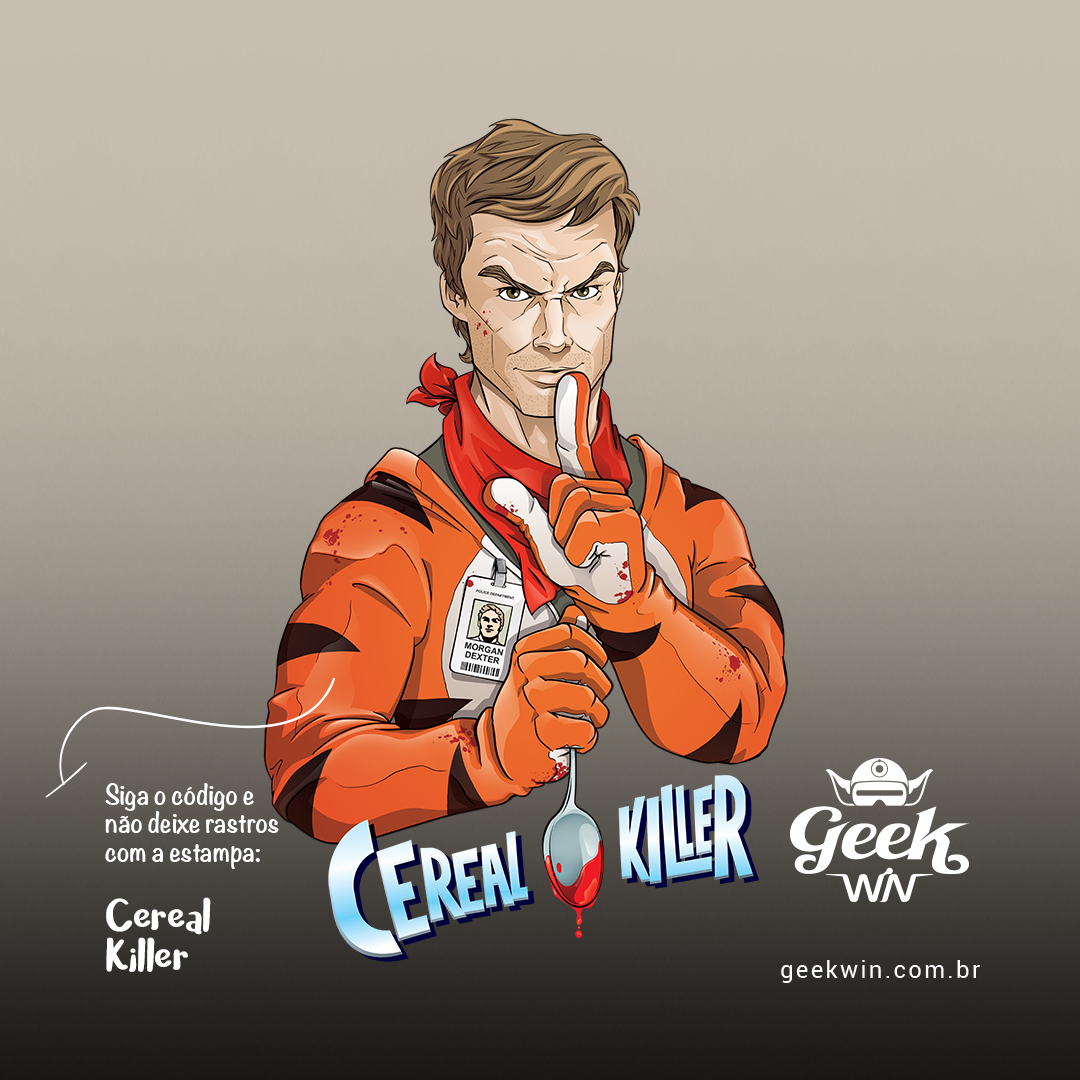 Fuja do comum com nossa estampa exclusiva "Cereal Killer". Neste crossover surpreendente, Dexter, o especialista forense que caça serial killers à noite, troca sua faca por uma colher de cereal ensanguentada, enquanto se veste como Tony, o Tigre, mascote dos Sucrilhos. O gesto silencioso com dedo nos lábios adiciona um toque misterioso. Uma fusão única entre o mundo sombrio de Dexter e o mascote matinal - um verdadeiro Cereal Killer!