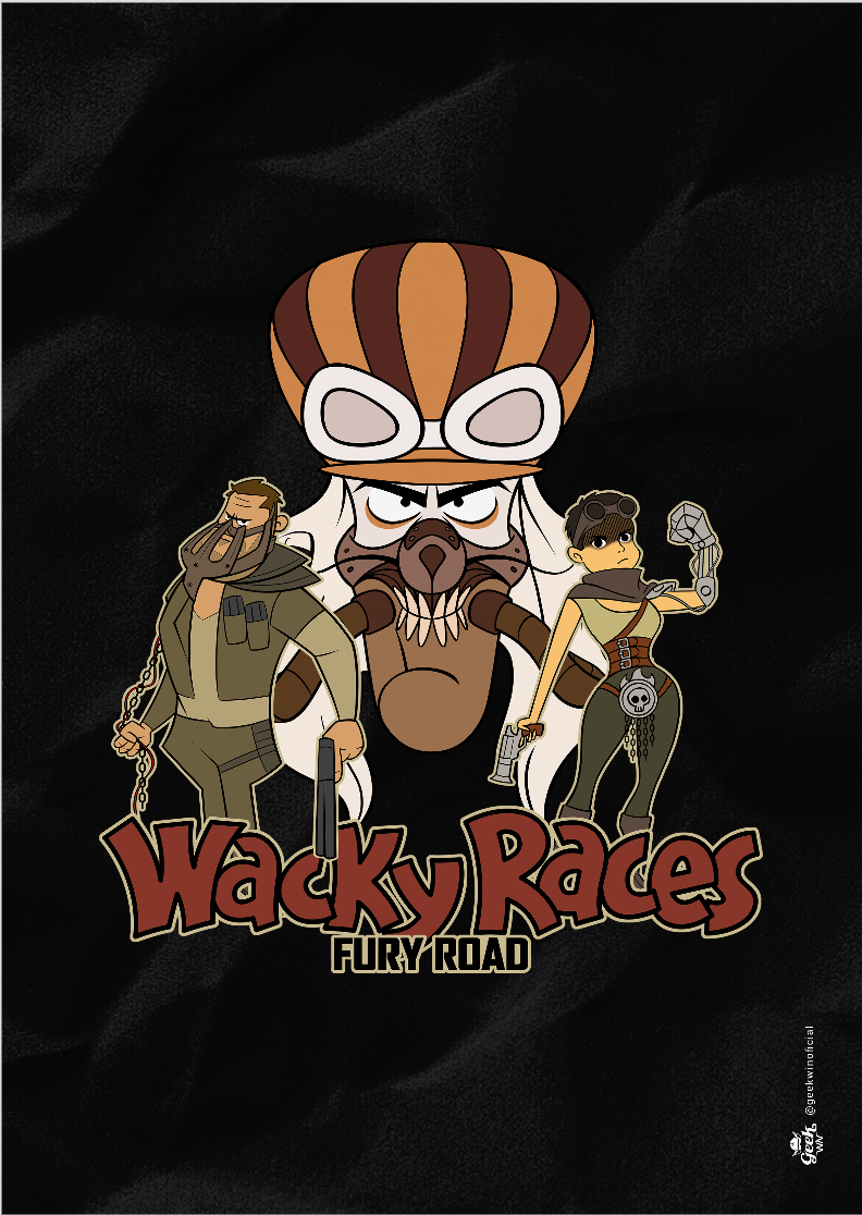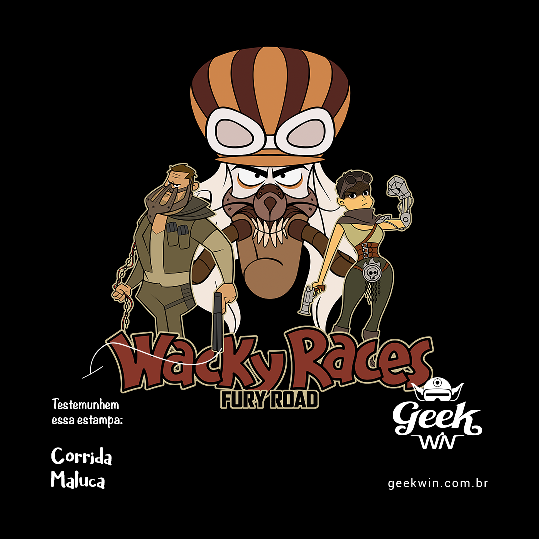 Explore o caos pós-apocalíptico da Estrada da Fúria em um crossover épico com os personagens da Corrida Maluca! Penélope Charmosa assume o papel de Furiosa, com seu olhar marcante e braço biônico, ao lado de Peter Perfeito como Max, ainda reconhecível como Bolsa de Sangue, amordaçado e acorrentado pelos Garotos de Guerra. No centro da estampa, Dick Vigarista personifica Immortan Joe, com seu olhar malévolo separando esses corredores improváveis. Reviva a loucura das corridas mais estranhas da história na Estrada da Fúria, capturada neste incrível design. #CorridaMaluca #MadMax #FuryRoad #Crossover #FashionGeek #PenelopeFuriosa #PeterMax #DickImmortanJoe #WackyRaces