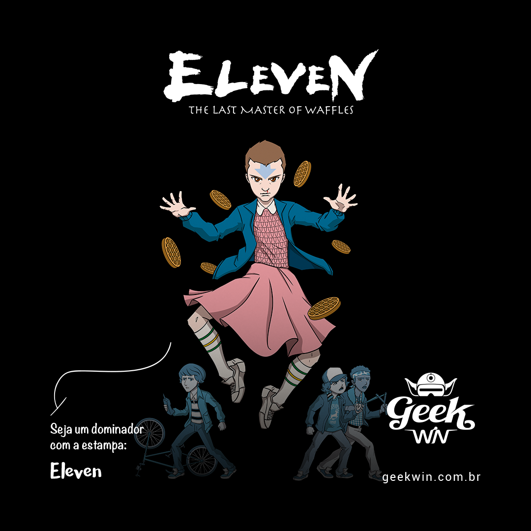 Explore o melhor dos dois mundos com a estampa 'Eleven' da Geek Win. Neste crossover inovador, mergulhamos no universo de 'Stranger Things' da Netflix e 'Avatar: A Lenda de Aang', também conhecido como 'Avatar: O Último Mestre do Ar'. A estampa captura o momento icônico em que a jovem Onze, conhecida como Eleven, é representada com sua aparência da primeira temporada, enquanto incorpora os traços distintivos de 'Avatar'. Aqui, vemos Eleven flutuando com a mesma postura de levitação que caracteriza Aang, um Dominador de Ar. A tatuagem de seta na cabeça de Aang é referenciada na testa de Eleven, enquanto detalhes como o sangue escorrendo pelo nariz de Eleven ao usar seus poderes de levitação são habilmente incorporados. A cena é complementada com waffles flutuando ao redor de Eleven, uma homenagem ao seu amor por waffles. O subtítulo da estampa, 'Eleven: The Last Master of Waffles', é uma divertida brincadeira com a tipografia do desenho 'Avatar', destacando a paixão única de Eleven. Celebre o encontro desses dois universos com estilo e criatividade com a estampa 'Eleven' da Geek Win.