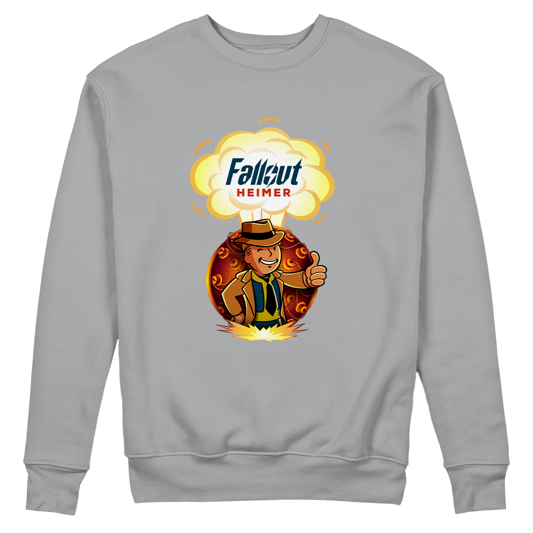 Atrás dele, a bomba que mudou o mundo para sempre, um lembrete constante das escolhas que moldaram este cenário pós-nuclear. O lettering "Fallout Heimer" une o universo de Fallout com um toque de criatividade, pronto para conquistar corações geeks e entusiastas do apocalipse.