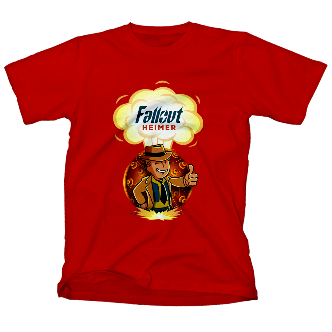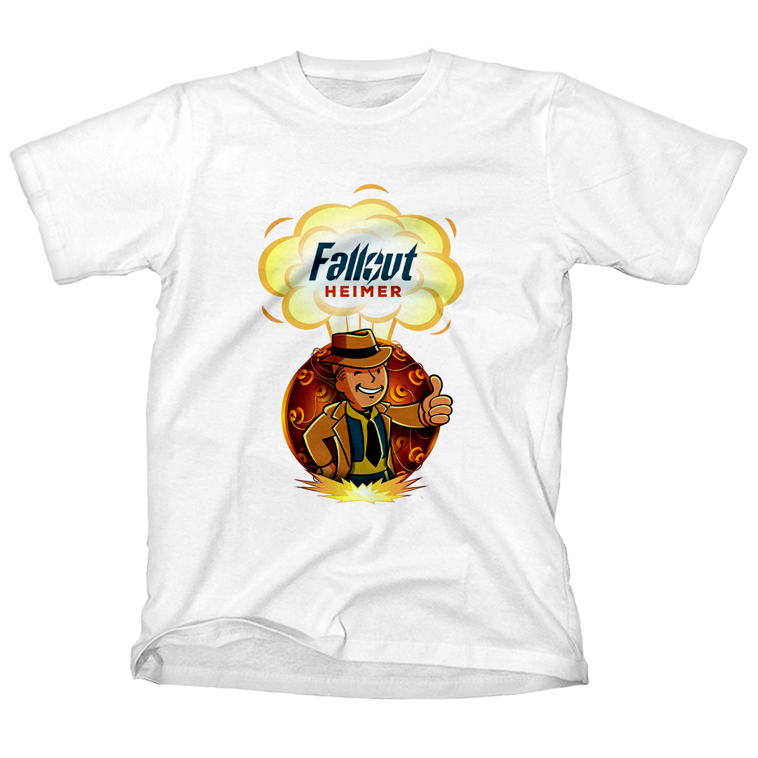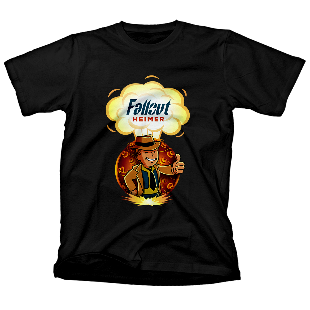 Atrás dele, a bomba que mudou o mundo para sempre, um lembrete constante das escolhas que moldaram este cenário pós-nuclear. O lettering "Fallout Heimer" une o universo de Fallout com um toque de criatividade, pronto para conquistar corações geeks e entusiastas do apocalipse.