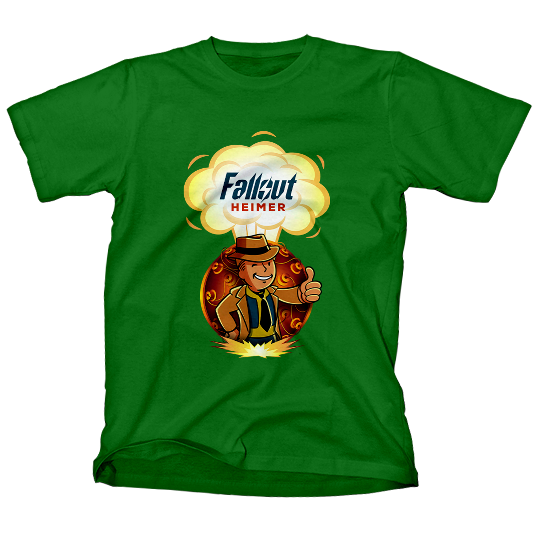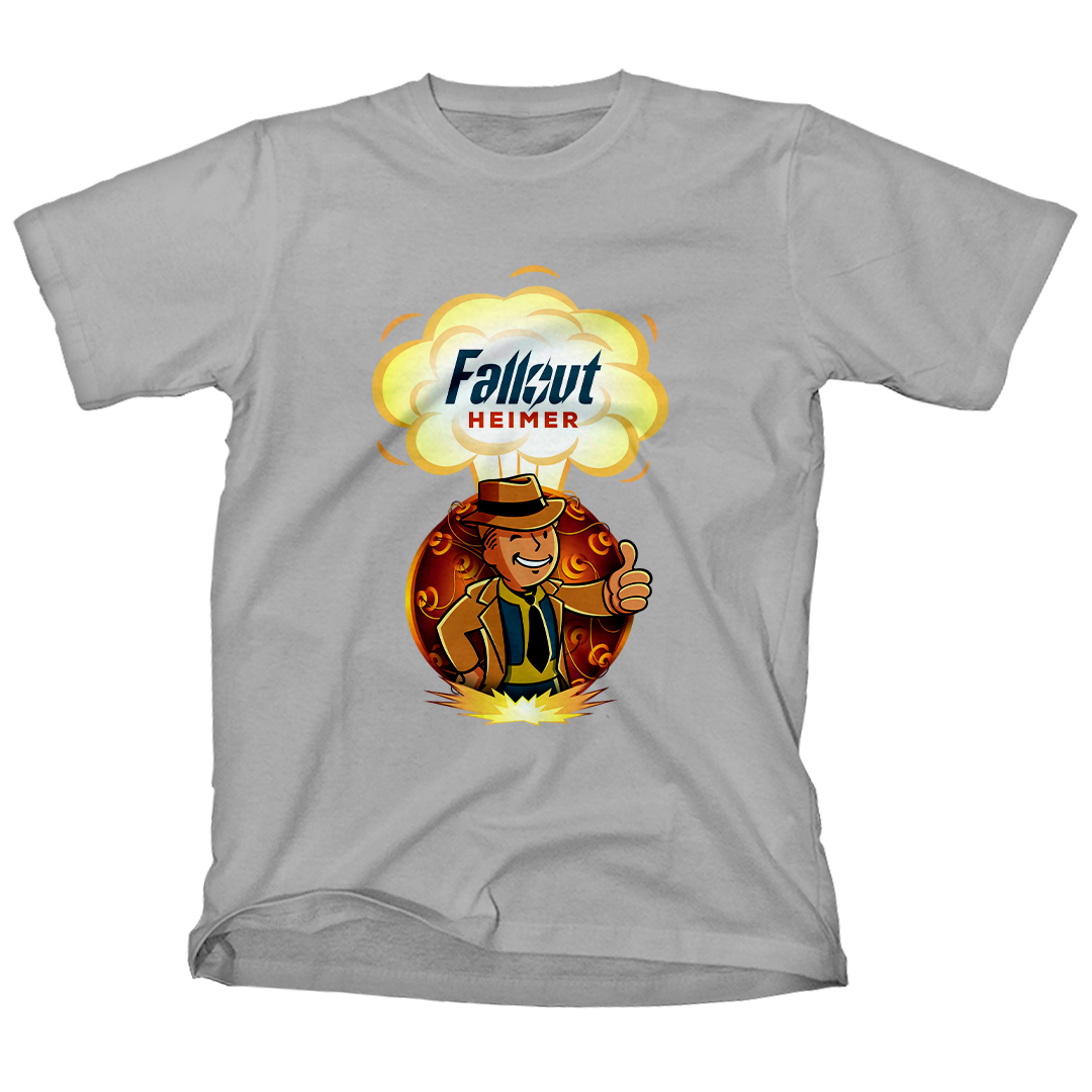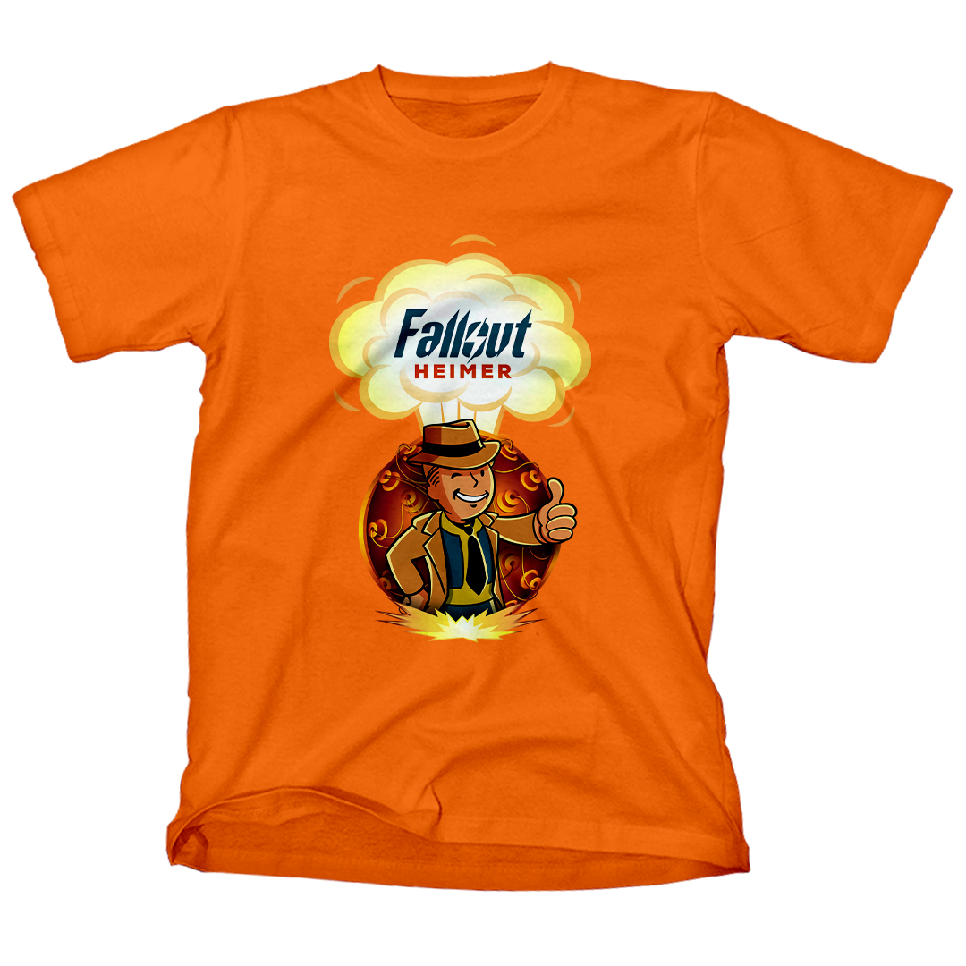 Atrás dele, a bomba que mudou o mundo para sempre, um lembrete constante das escolhas que moldaram este cenário pós-nuclear. O lettering "Fallout Heimer" une o universo de Fallout com um toque de criatividade, pronto para conquistar corações geeks e entusiastas do apocalipse.