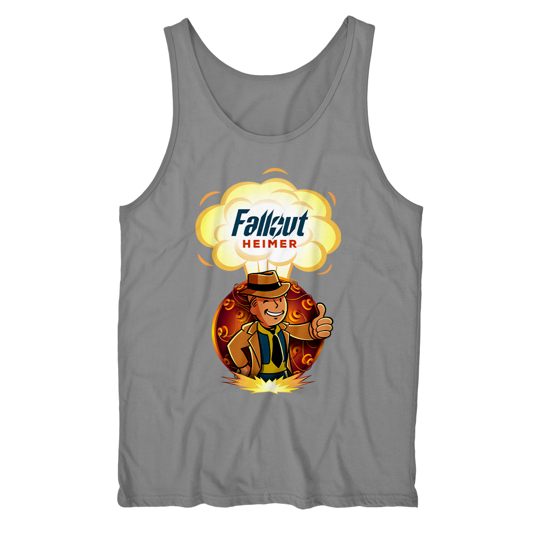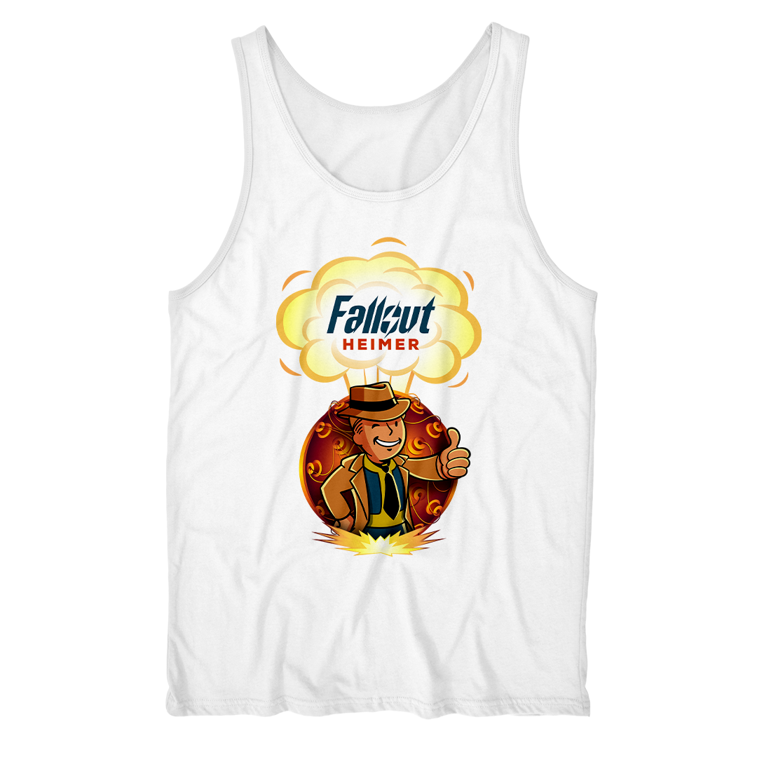 Atrás dele, a bomba que mudou o mundo para sempre, um lembrete constante das escolhas que moldaram este cenário pós-nuclear. O lettering "Fallout Heimer" une o universo de Fallout com um toque de criatividade, pronto para conquistar corações geeks e entusiastas do apocalipse.