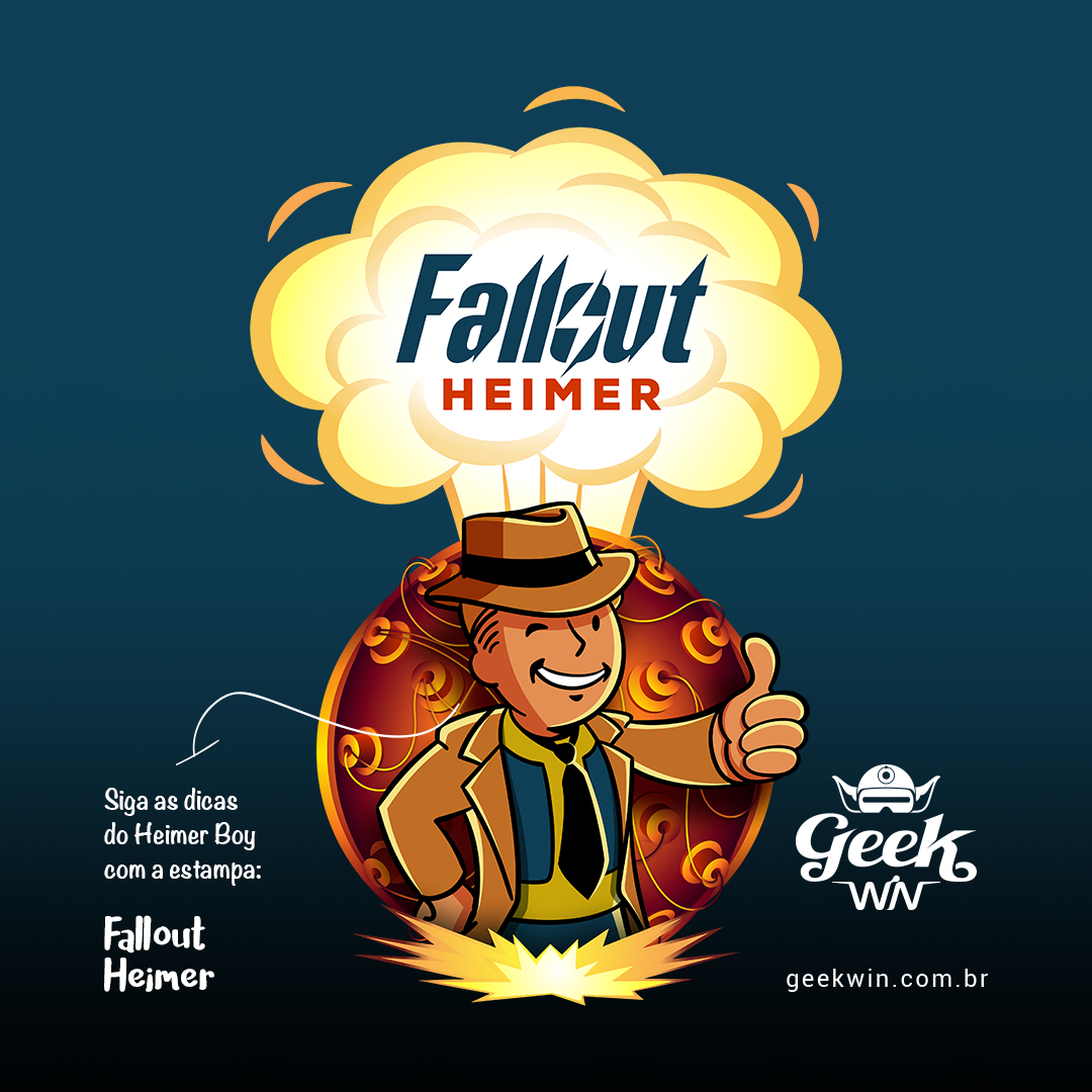 Atrás dele, a bomba que mudou o mundo para sempre, um lembrete constante das escolhas que moldaram este cenário pós-nuclear. O lettering "Fallout Heimer" une o universo de Fallout com um toque de criatividade, pronto para conquistar corações geeks e entusiastas do apocalipse.