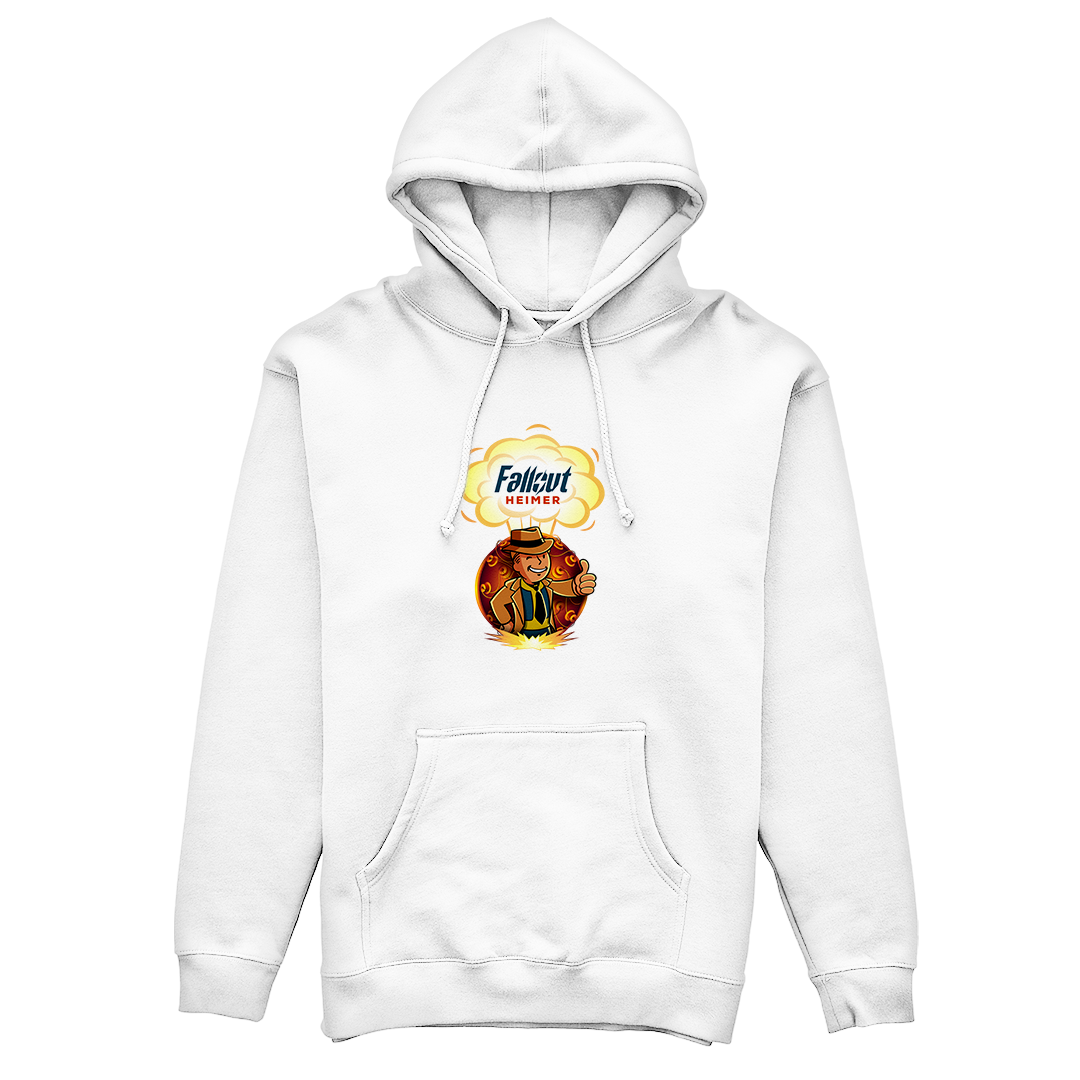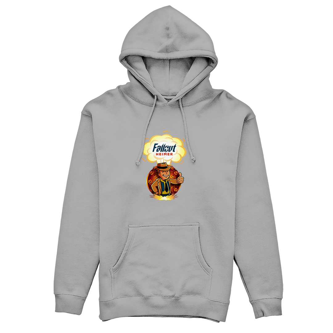 Atrás dele, a bomba que mudou o mundo para sempre, um lembrete constante das escolhas que moldaram este cenário pós-nuclear. O lettering "Fallout Heimer" une o universo de Fallout com um toque de criatividade, pronto para conquistar corações geeks e entusiastas do apocalipse.