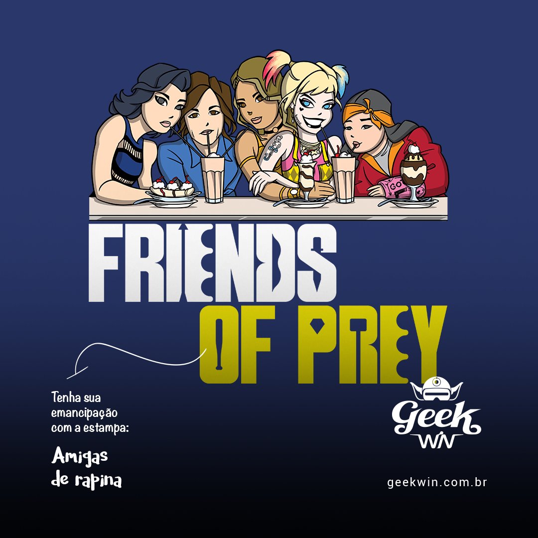 Friends of Prey, uma fusão hilária entre Birds of Prey e a amada série Friends, exclusiva da Geek Win! Mergulhe nesse crossover único onde os personagens de Birds of Prey recriam a icônica cena do grupo de amigos de Friends, com uma pitada de loucura da Arlequina. Uma mistura perfeita de humor e referências geek! #FriendsOfPrey #CrossoverGeek #Arlequina #BirdsOfPrey #FriendsParody #EstampaDivertida #NerdFashion #GeekWinExclusive
