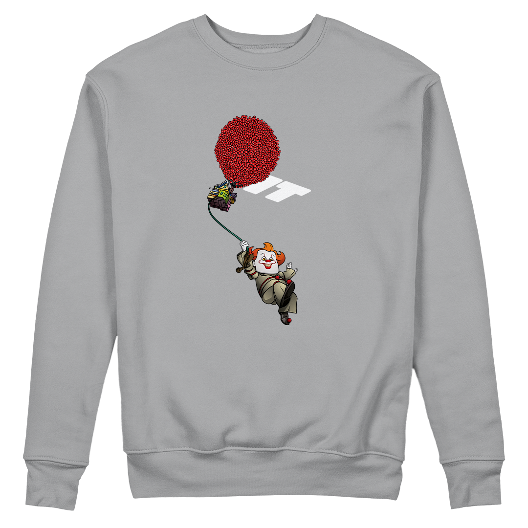 Experimente a mistura incrível entre UP, Altas Aventuras e IT: A Coisa com nossa estampa exclusiva! Testemunhe a cena icônica de UP, onde Carl Fredricksen voa com sua casa presa a balões, mas com um toque sombrio - Carl é reinventado como Pennywise, o palhaço assustador de IT. A estampa destaca a fusão adorável dos traços da Disney Pixar com o terror de Stephen King. Os balões vermelhos, em vez de coloridos, dão um toque sinistro, e o lettering surpreendentemente exibe "IT" ao invés de "UP