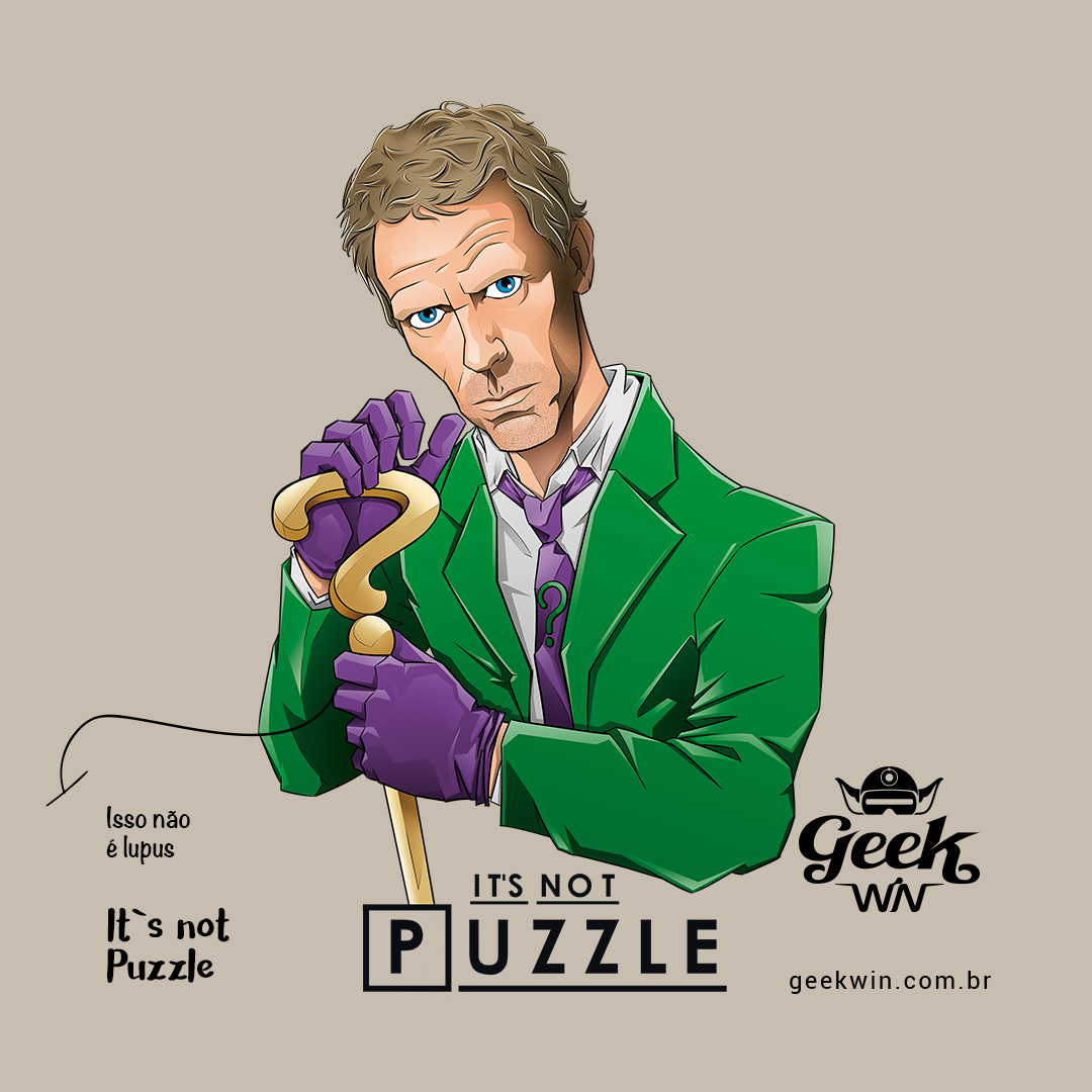 Em um intrigante crossover, testemunhe Dr. House, o genial e sarcástico médico, encarnando a mente enigmática do Charada, o icônico vilão de Batman. Com sua característica bengala de interrogação, House desafia não apenas diagnósticos médicos, mas também os próprios enigmas do Charada. Nesta estampa única, o bordão famoso de House - 'It's not lupus' - ganha uma reviravolta, transformando-se em 'It's not Puzzle,' uma alusão inteligente aos quebra-cabeças do Charada. Uma fusão intrigante de dois universos, onde o médico e o vilão se entrelaçam em um enigma próprio.