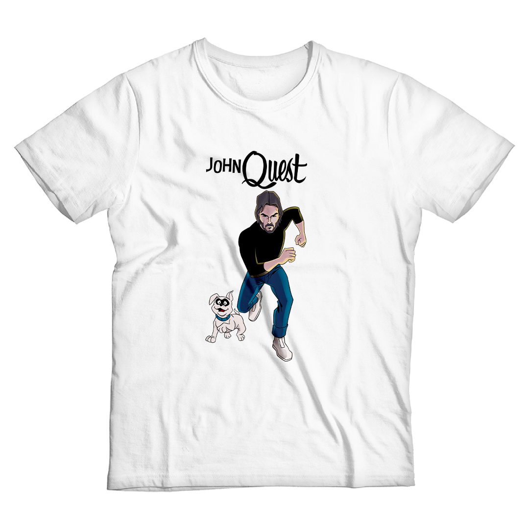 Entre na ação com a estampa John Quest, o épico crossover entre o clássico desenho Jonny Quest e a franquia de filmes John Wick. Aqui, John Wick assume o papel de Jonny, correndo destemidamente ao lado de seu leal cão, Bandit. Uma homenagem divertida que combina o mundo de aventuras do desenho animado com a intensidade do universo cinematográfico de John Wick. Prepare-se para uma jornada única com John Quest, onde a nostalgia se encontra com a ação implacável.