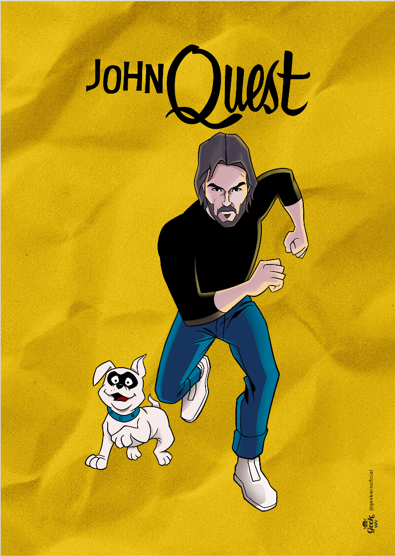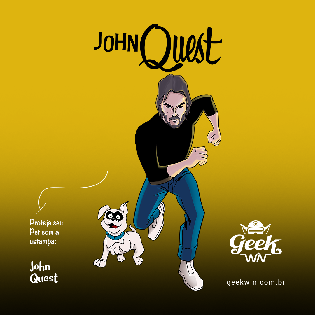 Entre na ação com a estampa John Quest, o épico crossover entre o clássico desenho Jonny Quest e a franquia de filmes John Wick. Aqui, John Wick assume o papel de Jonny, correndo destemidamente ao lado de seu leal cão, Bandit. Uma homenagem divertida que combina o mundo de aventuras do desenho animado com a intensidade do universo cinematográfico de John Wick. Prepare-se para uma jornada única com John Quest, onde a nostalgia se encontra com a ação implacável.