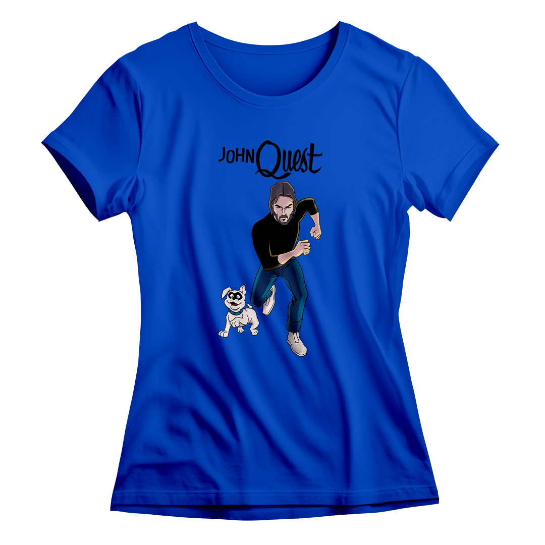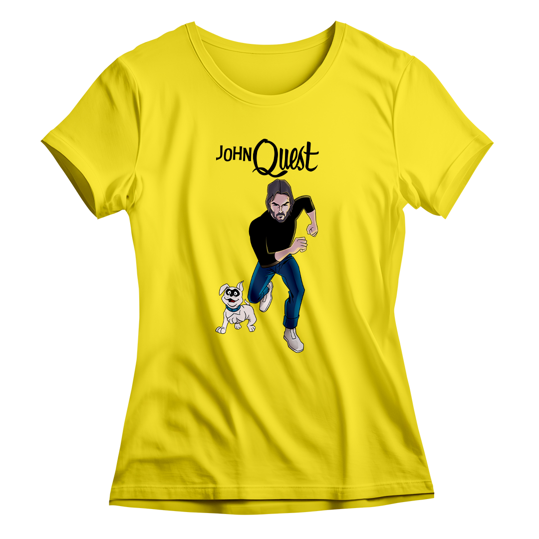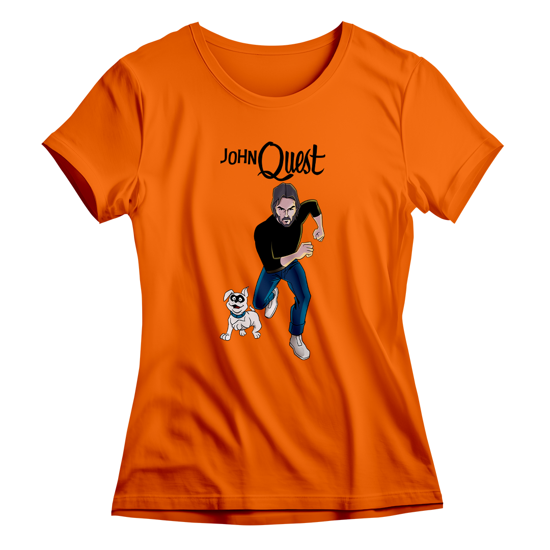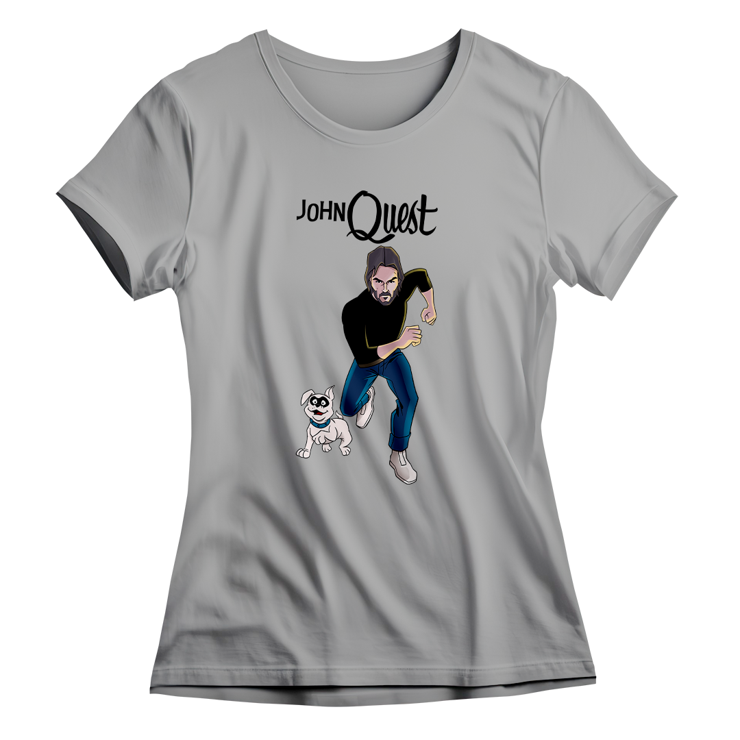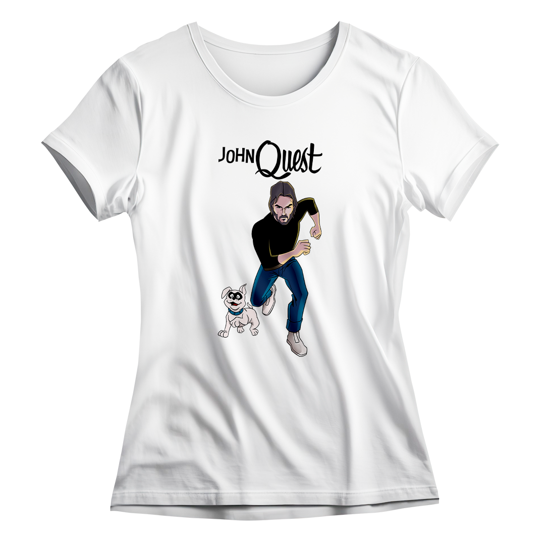 Entre na ação com a estampa John Quest, o épico crossover entre o clássico desenho Jonny Quest e a franquia de filmes John Wick. Aqui, John Wick assume o papel de Jonny, correndo destemidamente ao lado de seu leal cão, Bandit. Uma homenagem divertida que combina o mundo de aventuras do desenho animado com a intensidade do universo cinematográfico de John Wick. Prepare-se para uma jornada única com John Quest, onde a nostalgia se encontra com a ação implacável.