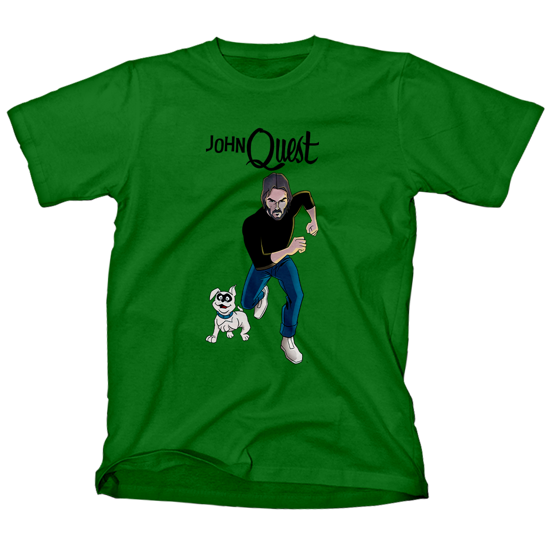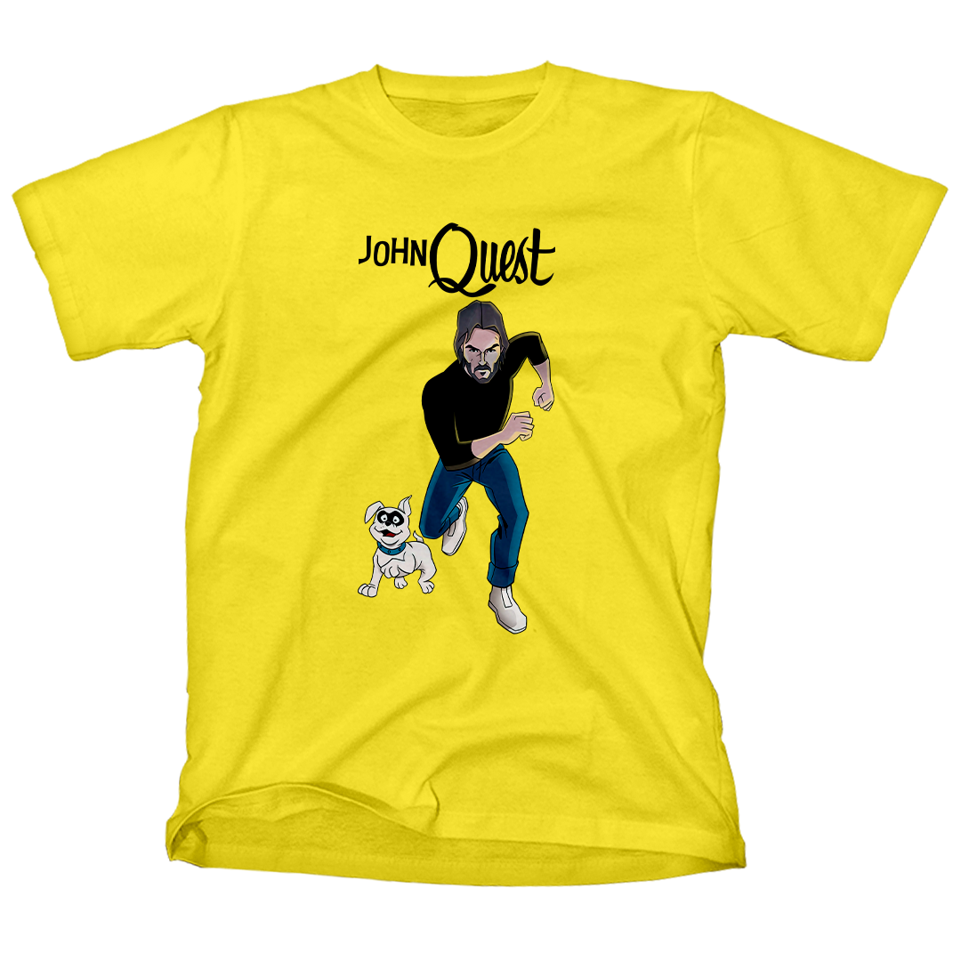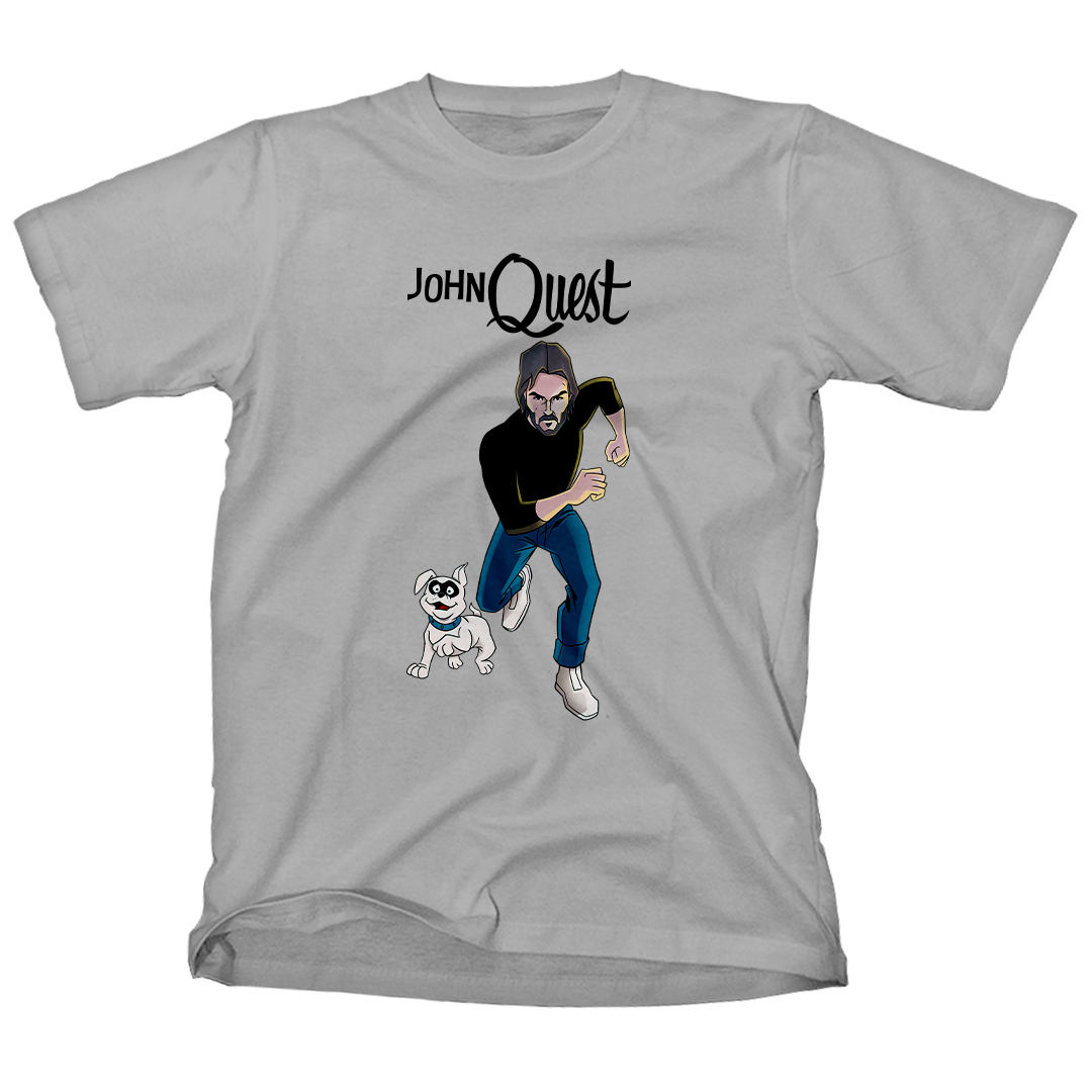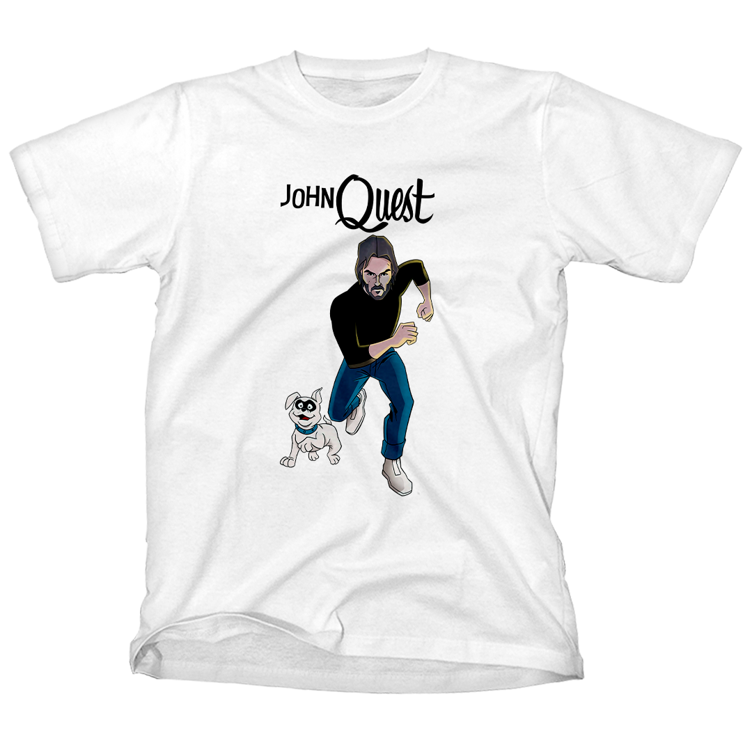 Entre na ação com a estampa John Quest, o épico crossover entre o clássico desenho Jonny Quest e a franquia de filmes John Wick. Aqui, John Wick assume o papel de Jonny, correndo destemidamente ao lado de seu leal cão, Bandit. Uma homenagem divertida que combina o mundo de aventuras do desenho animado com a intensidade do universo cinematográfico de John Wick. Prepare-se para uma jornada única com John Quest, onde a nostalgia se encontra com a ação implacável.