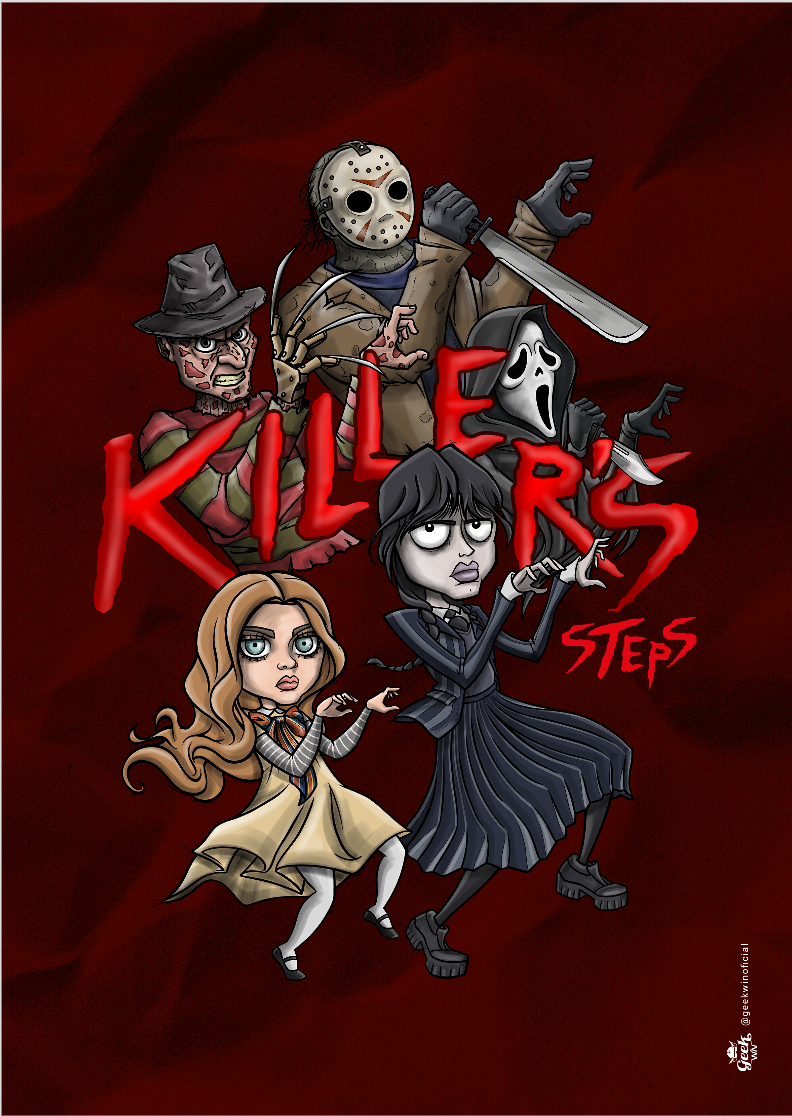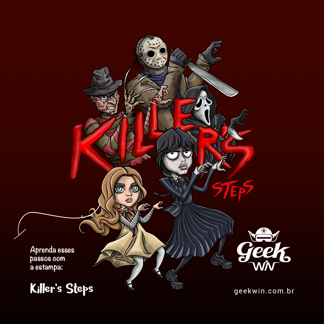 Nossa estampa de Halloween apresenta um crossover surpreendente entre Wandinha da série de Tim Burton e Megan do filme de James Wan, dançando a coreografia de "Thriller" de Michael Jackson no centro da cena. Enquanto as novas adições à cultura do terror se divertem com a dança, os ícones clássicos, como Freddy Krueger, Jason e Ghost Face, estão habilmente incorporados à coreografia, proporcionando uma reviravolta emocionante. Com um lettering destacando "Killer's", essa estampa única combina elementos de diferentes gerações de personagens do terror, criando uma peça de moda distintiva para entusiastas da cultura pop e do horror.