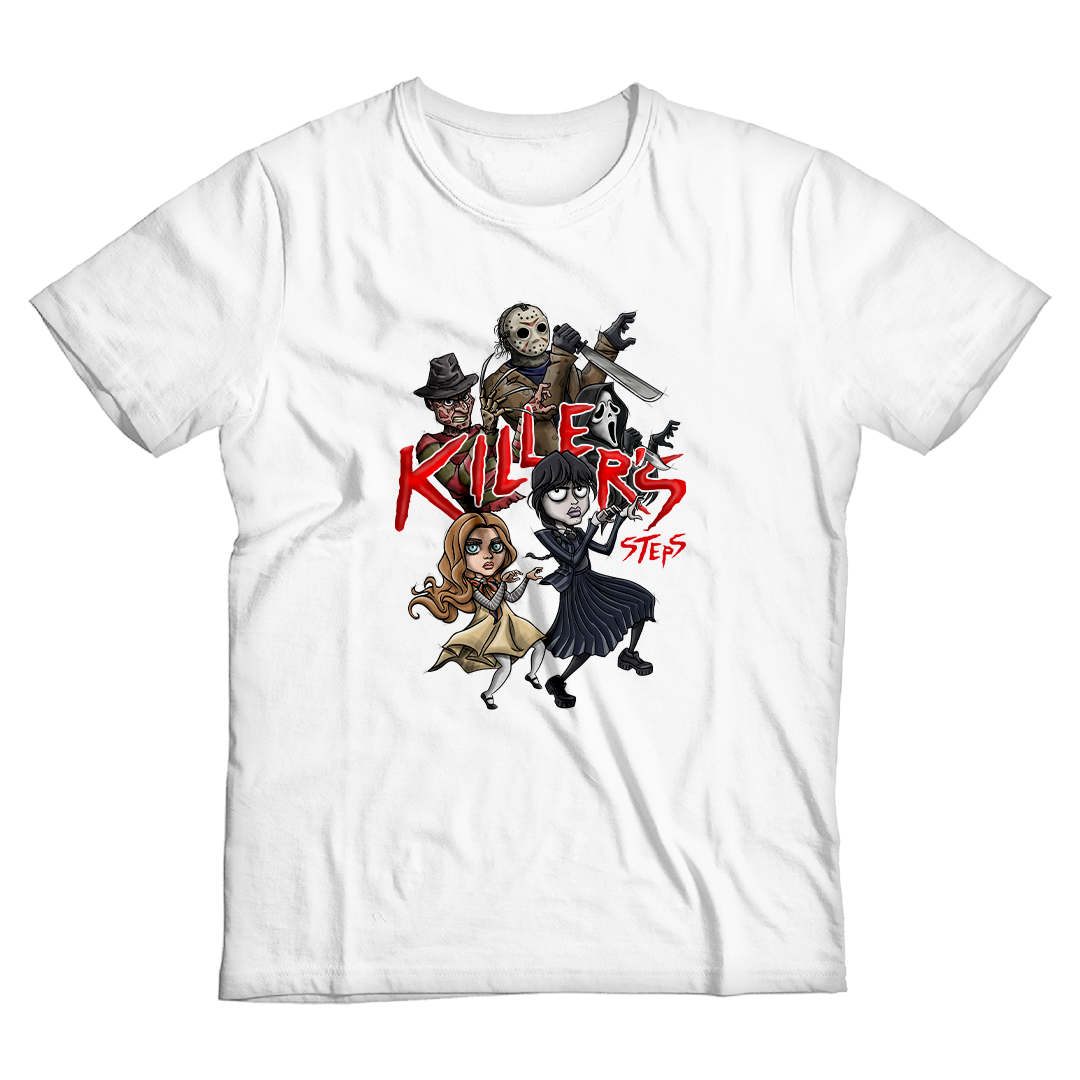 Nossa estampa de Halloween apresenta um crossover surpreendente entre Wandinha da série de Tim Burton e Megan do filme de James Wan, dançando a coreografia de "Thriller" de Michael Jackson no centro da cena. Enquanto as novas adições à cultura do terror se divertem com a dança, os ícones clássicos, como Freddy Krueger, Jason e Ghost Face, estão habilmente incorporados à coreografia, proporcionando uma reviravolta emocionante. Com um lettering destacando "Killer's", essa estampa única combina elementos de diferentes gerações de personagens do terror, criando uma peça de moda distintiva para entusiastas da cultura pop e do horror.