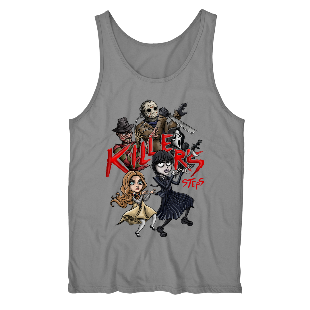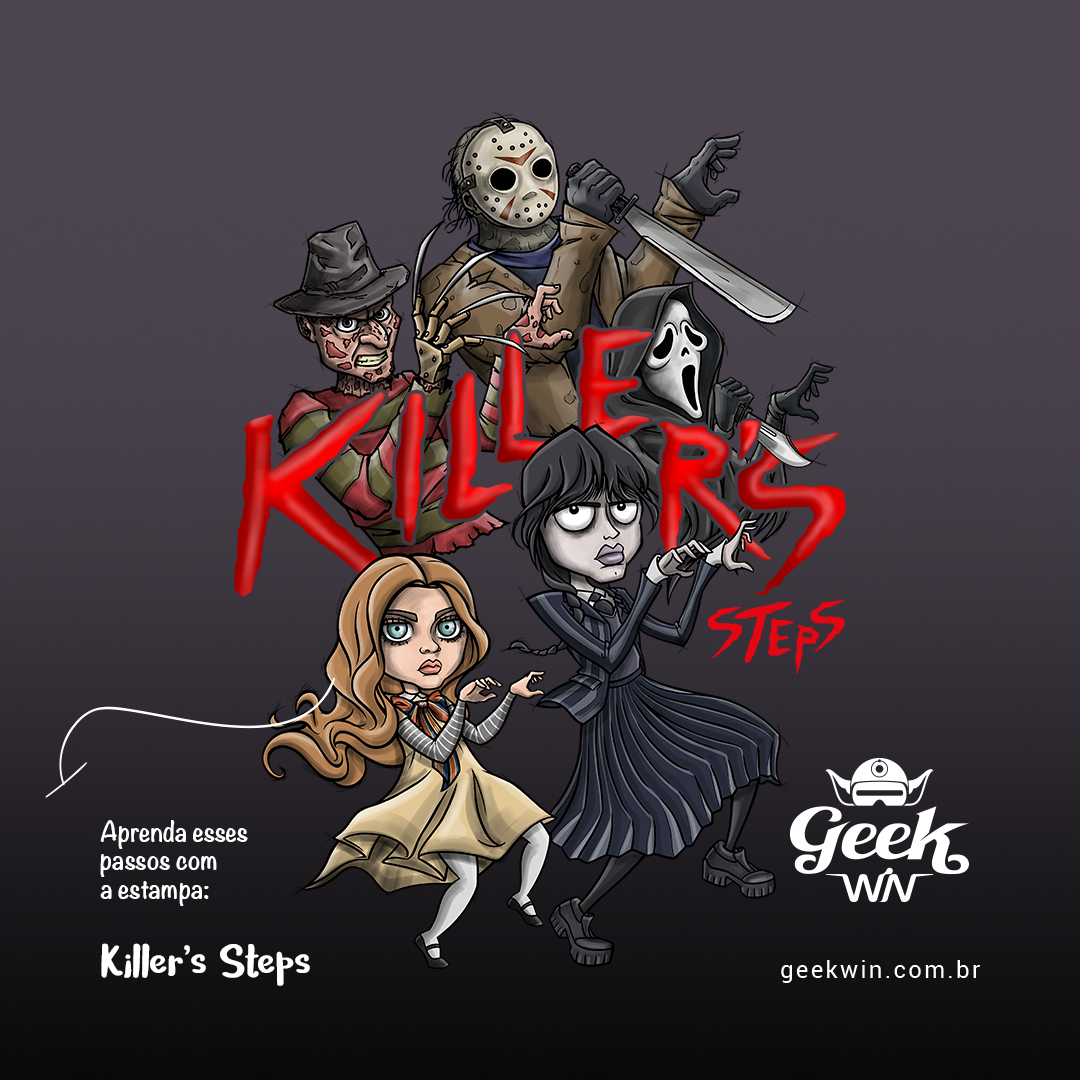 Nossa estampa de Halloween apresenta um crossover surpreendente entre Wandinha da série de Tim Burton e Megan do filme de James Wan, dançando a coreografia de "Thriller" de Michael Jackson no centro da cena. Enquanto as novas adições à cultura do terror se divertem com a dança, os ícones clássicos, como Freddy Krueger, Jason e Ghost Face, estão habilmente incorporados à coreografia, proporcionando uma reviravolta emocionante. Com um lettering destacando "Killer's", essa estampa única combina elementos de diferentes gerações de personagens do terror, criando uma peça de moda distintiva para entusiastas da cultura pop e do horror.