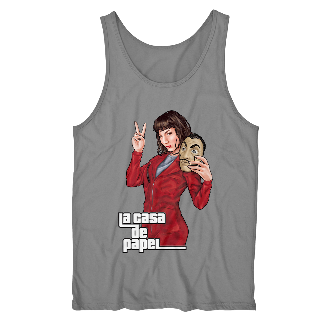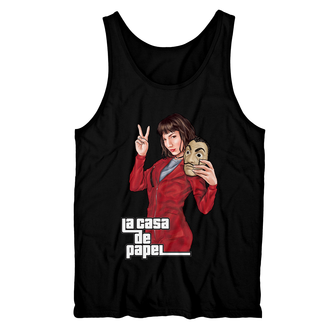 Em uma paródia única, a estampa "La Casa de Papel" traz o universo de Tóquio em um encontro explosivo com o estilo característico de Grand Theft Auto (GTA). Vestida com seu icônico uniforme vermelho, Tóquio segura a máscara de Salvador Dalí, um símbolo marcante da série. Em uma vibe totalmente GTA, ela faz o sinal de V com os dedos, enquanto o lettering "La Casa de Papel" assume a estética inconfundível do universo dos games. Uma fusão envolvente entre dois mundos distintos, oferecendo uma visão única e estilizada dessa personagem cativante. #LaCasadePapel #GTA #Crossover #EstampaNetflix #Tóquio #SalvadorDalí #ModaGeek #SérieEspanhola #GrandTheftAuto