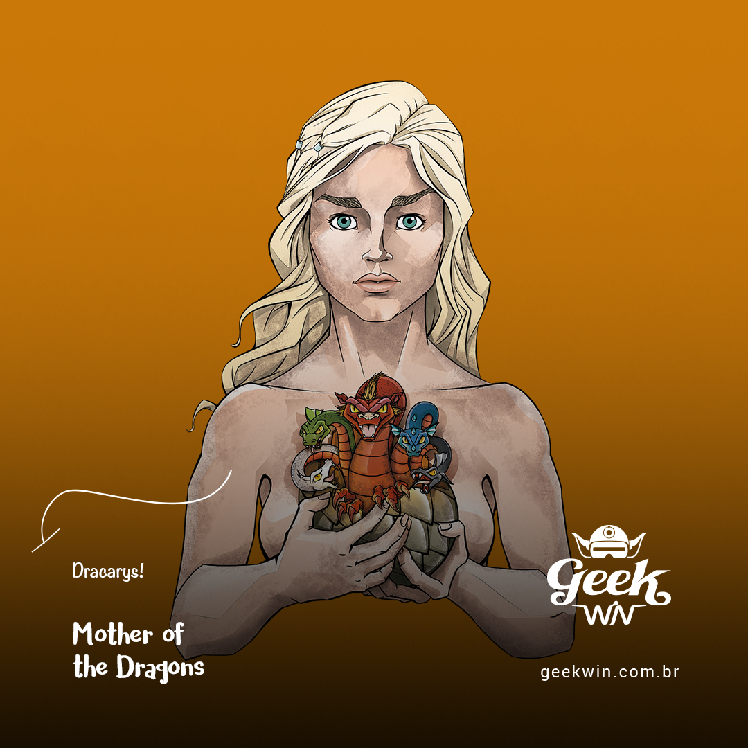 Desvende o mundo mágico desta estampa única! "Mother of the Dragons" traz Daenerys Targaryen, a Mãe de Dragões de Game of Thrones, revelando um inesperado filhote de Tiamat, a lendária criatura de Dungeons & Dragons, conhecida como Caverna do Dragão no Brasil. Com toda a majestade e títulos que carrega, Daenerys surge diante do ovo que chocou, revelando as cinco cabeças da impressionante Tiamat. Uma fusão épica entre universos que vai além das chamas e encanta os fãs de Game of Thrones e Dungeons & Dragons. #MotheroftheDragons #GameofThrones #DungeonsandDragons #CavernadoDragão #CrossoverÉpico #ModaGeek #DaenerysTargaryen #Tiamat #EstampaExclusiva #DragõesMágicos #FantasiaNerd