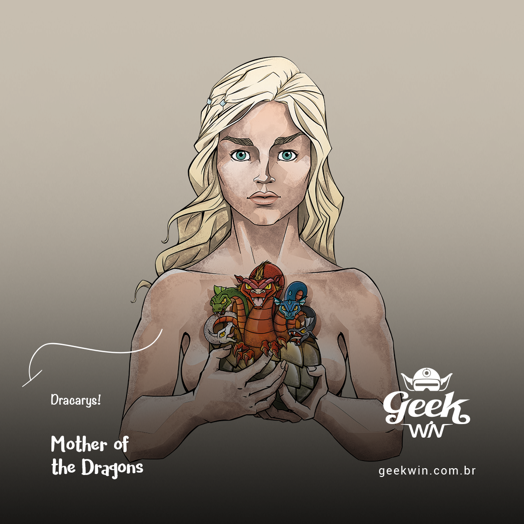 Desvende o mundo mágico desta estampa única! "Mother of the Dragons" traz Daenerys Targaryen, a Mãe de Dragões de Game of Thrones, revelando um inesperado filhote de Tiamat, a lendária criatura de Dungeons & Dragons, conhecida como Caverna do Dragão no Brasil. Com toda a majestade e títulos que carrega, Daenerys surge diante do ovo que chocou, revelando as cinco cabeças da impressionante Tiamat. Uma fusão épica entre universos que vai além das chamas e encanta os fãs de Game of Thrones e Dungeons & Dragons. #MotheroftheDragons #GameofThrones #DungeonsandDragons #CavernadoDragão #CrossoverÉpico #ModaGeek #DaenerysTargaryen #Tiamat #EstampaExclusiva #DragõesMágicos #FantasiaNerd