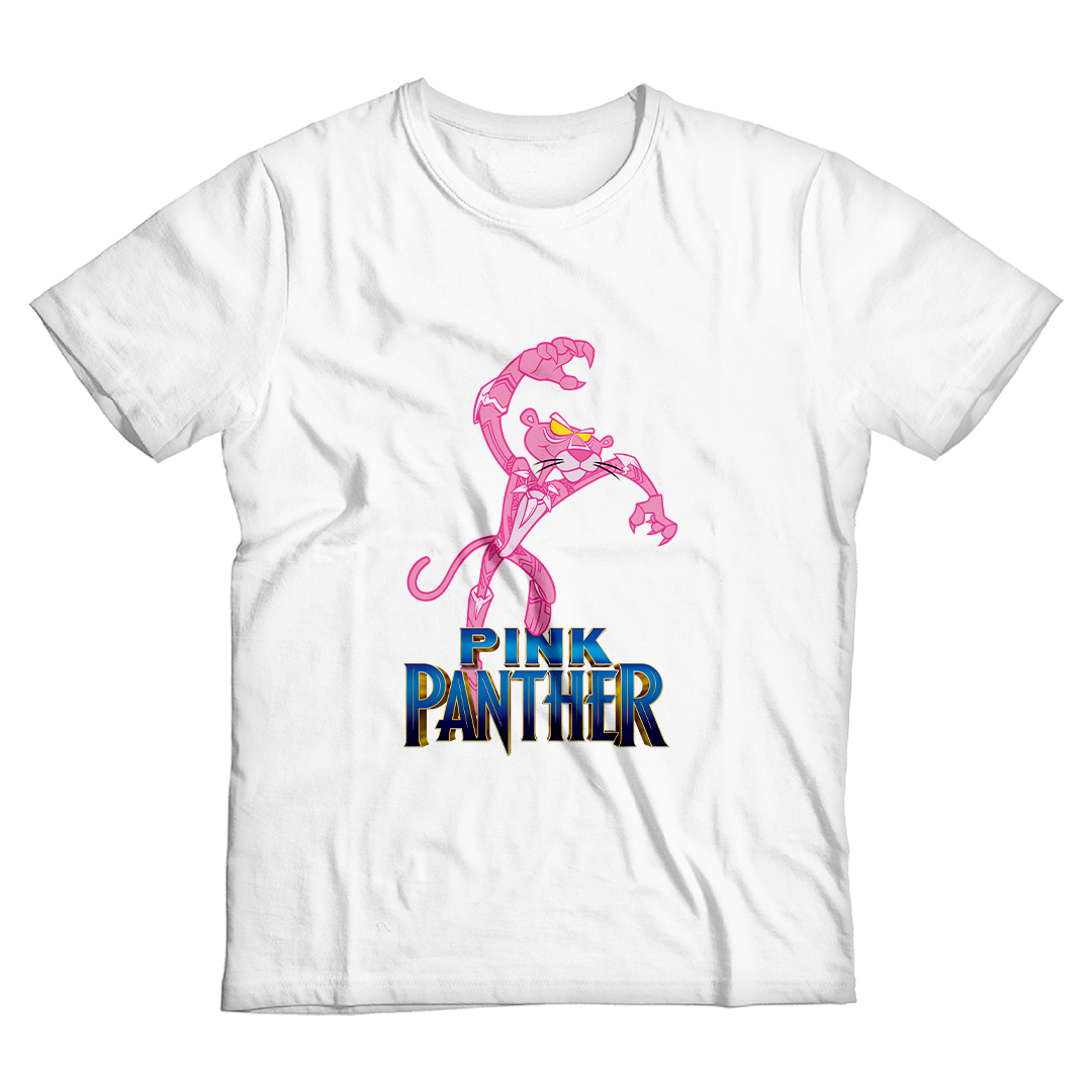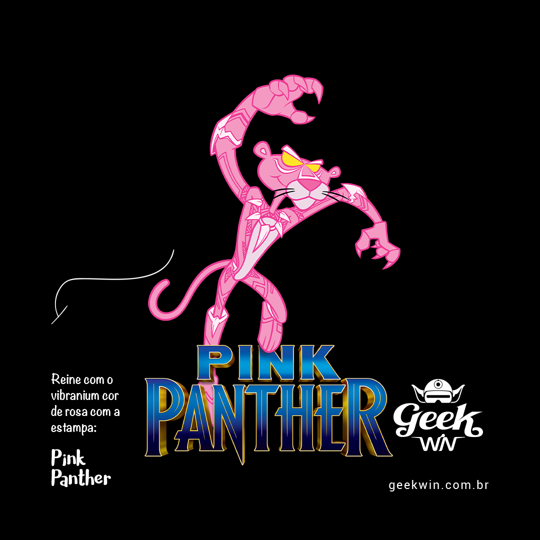Desperte seu lado selvagem com a estampa "Pink Panther" da Geek Win. Nesse crossover exclusivo, a icônica Pantera Cor de Rosa abraça a vibração do Pantera Negra da Marvel, vestindo seu manto rosa em um salto elegante. Descubra a elegância com um toque de comédia nessa fusão única. #PinkPanther #CrossoverGeek #EstampaExclusiva #PanteraCordeRosa #BlackPanther #GeekWinStyle #CamisetaNerd