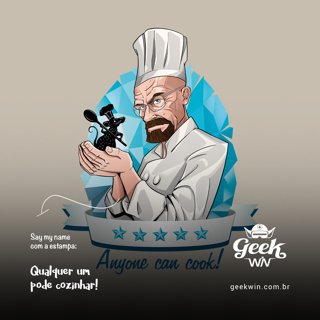 Entre no mundo culinário insano desta estampa incrível! Imagina só o Walter White, o mestre da química de Breaking Bad, virando chef e dando uma mãozinha para o Remy, o ratinho cozinheiro de Ratatouille. Aqui, eles estão prontos para aprontar na cozinha. Walter, ou melhor, o Chef Heisenberg, está lá, todo elegante, apoiando o Remy com sua colher de cozinha. E claro, não poderia faltar o letreiro de restaurante chique com cinco estrelas, só que com um toque azul metanfetamina! Tudo isso celebrando a ideia de que, no final das contas, 'Qualquer um Pode Cozinhar'. Vem saborear essa mistura única de universos com a gente!