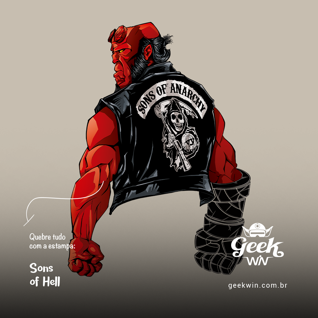 Desvende o crossover épico nesta estampa exclusiva! O anti-herói Hellboy encontra a selvagem gangue de motociclistas de Sons of Anarchy. Com Ron Perlman interpretando ambos os personagens, Hellboy adota o estilo da gangue, vestindo a icônica jaqueta, revelando um encontro inusitado e cheio de atitude. Uma fusão única entre o sobrenatural e o mundo das estradas. Garanta já a sua dose de rebeldia com a estampa Sons of Hell!