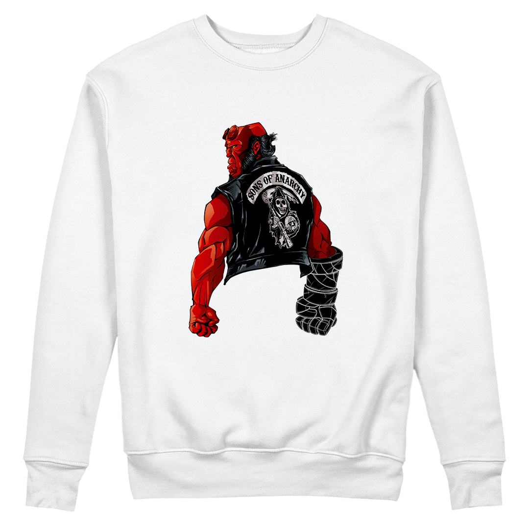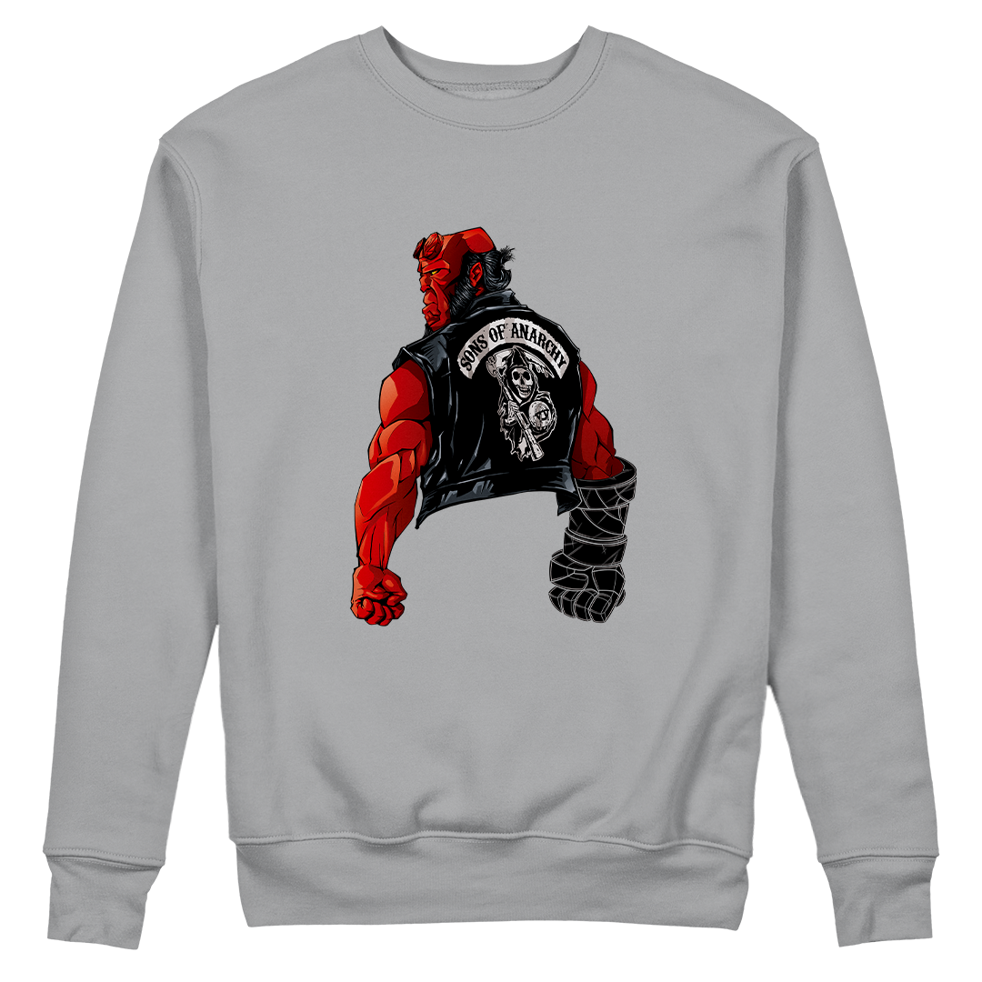 Desvende o crossover épico nesta estampa exclusiva! O anti-herói Hellboy encontra a selvagem gangue de motociclistas de Sons of Anarchy. Com Ron Perlman interpretando ambos os personagens, Hellboy adota o estilo da gangue, vestindo a icônica jaqueta, revelando um encontro inusitado e cheio de atitude. Uma fusão única entre o sobrenatural e o mundo das estradas. Garanta já a sua dose de rebeldia com a estampa Sons of Hell!