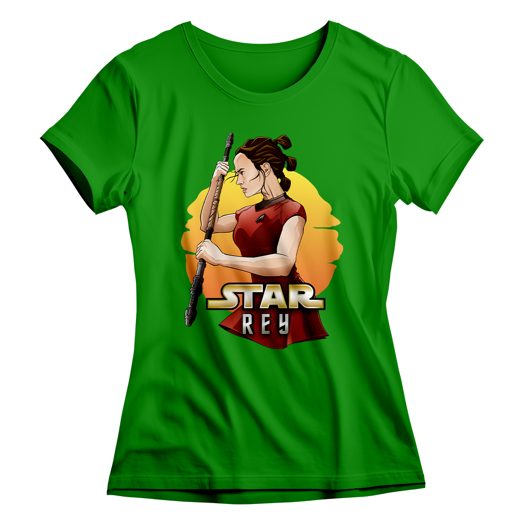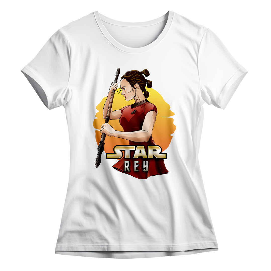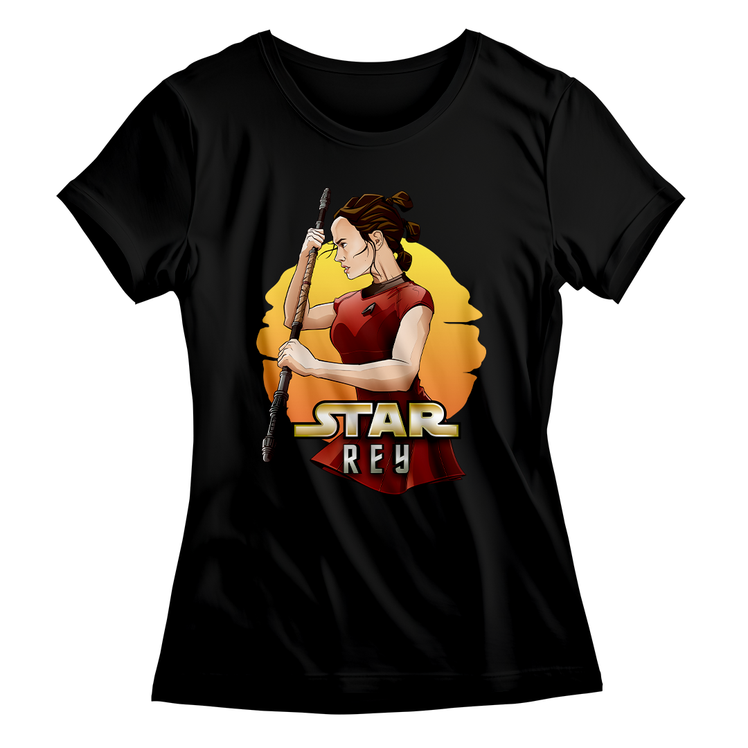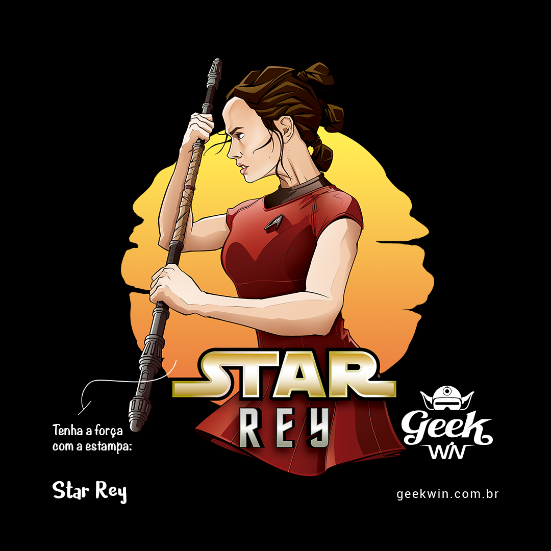 Na estampa 'Star Rey', mergulhamos fundo em um intrigante crossover que funde dois universos icônicos: Star Wars e Star Trek Além da Escuridão. O que torna essa criação verdadeiramente especial é a união de elementos tão distintos quanto a fantasia de Star Wars e a ficção científica de Star Trek. Nela, a protagonista Rey de Star Wars episódio 7 veste o uniforme de Uhura de Star Trek, desafiando as fronteiras dos gêneros. Esse crossover destemido e criativo celebra a paixão por ambos os mundos, provando que, na Geek Win, não há limites para a criatividade e a expressão de amor à cultura geek. O lettering 'Star Rey' incorpora a tipografia da franquia Star Wars em 'Star' e a tipografia de Star Trek em 'Rey', unindo visualmente os dois universos.