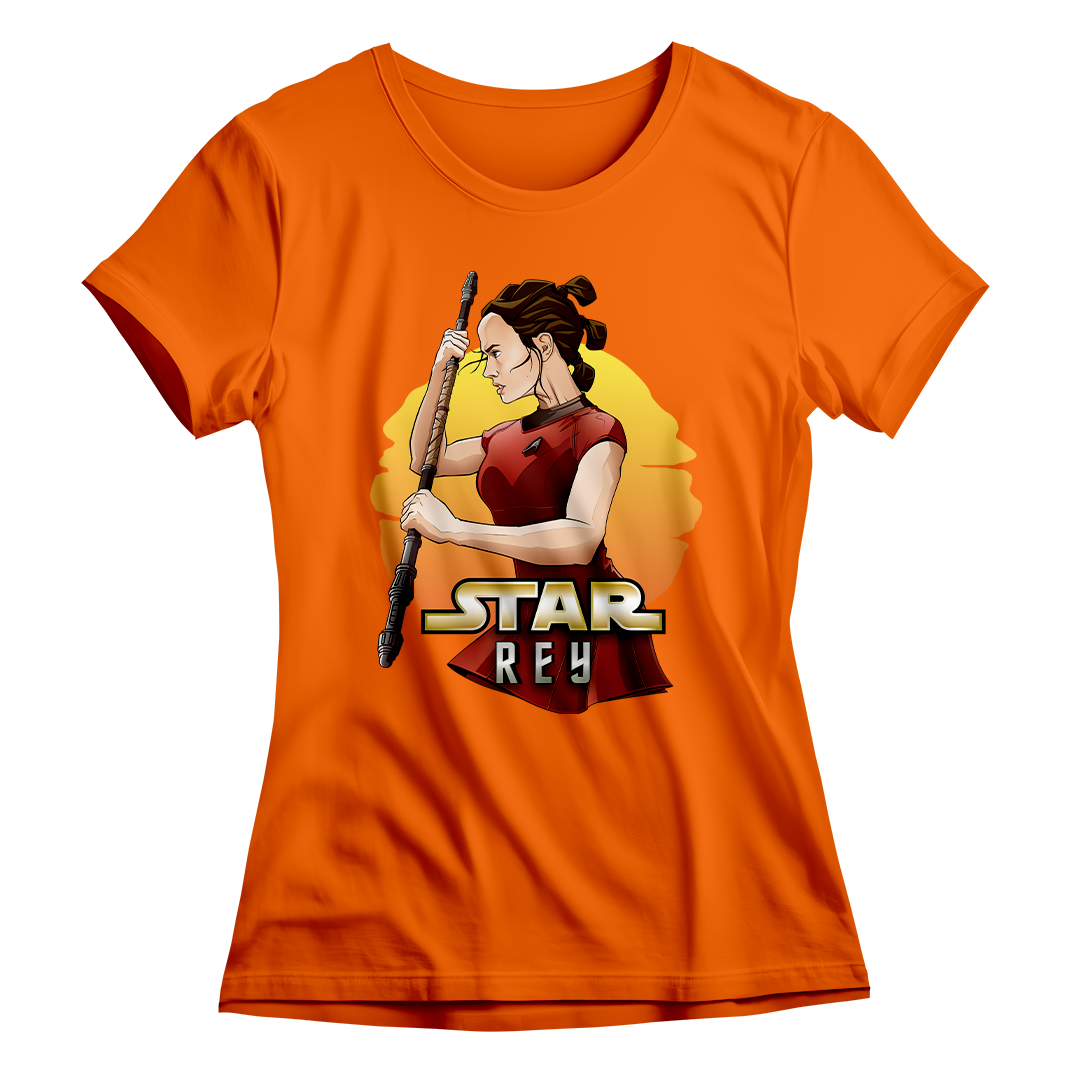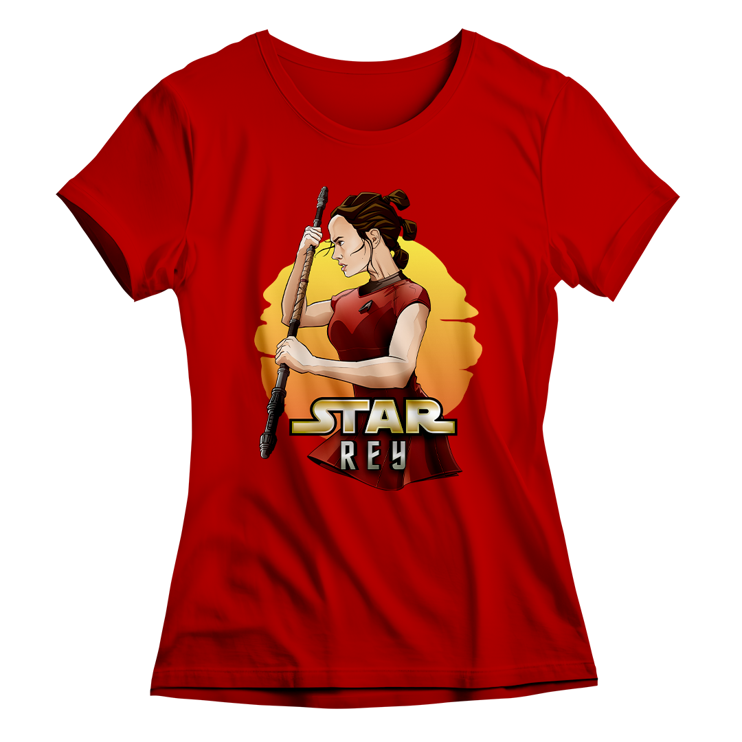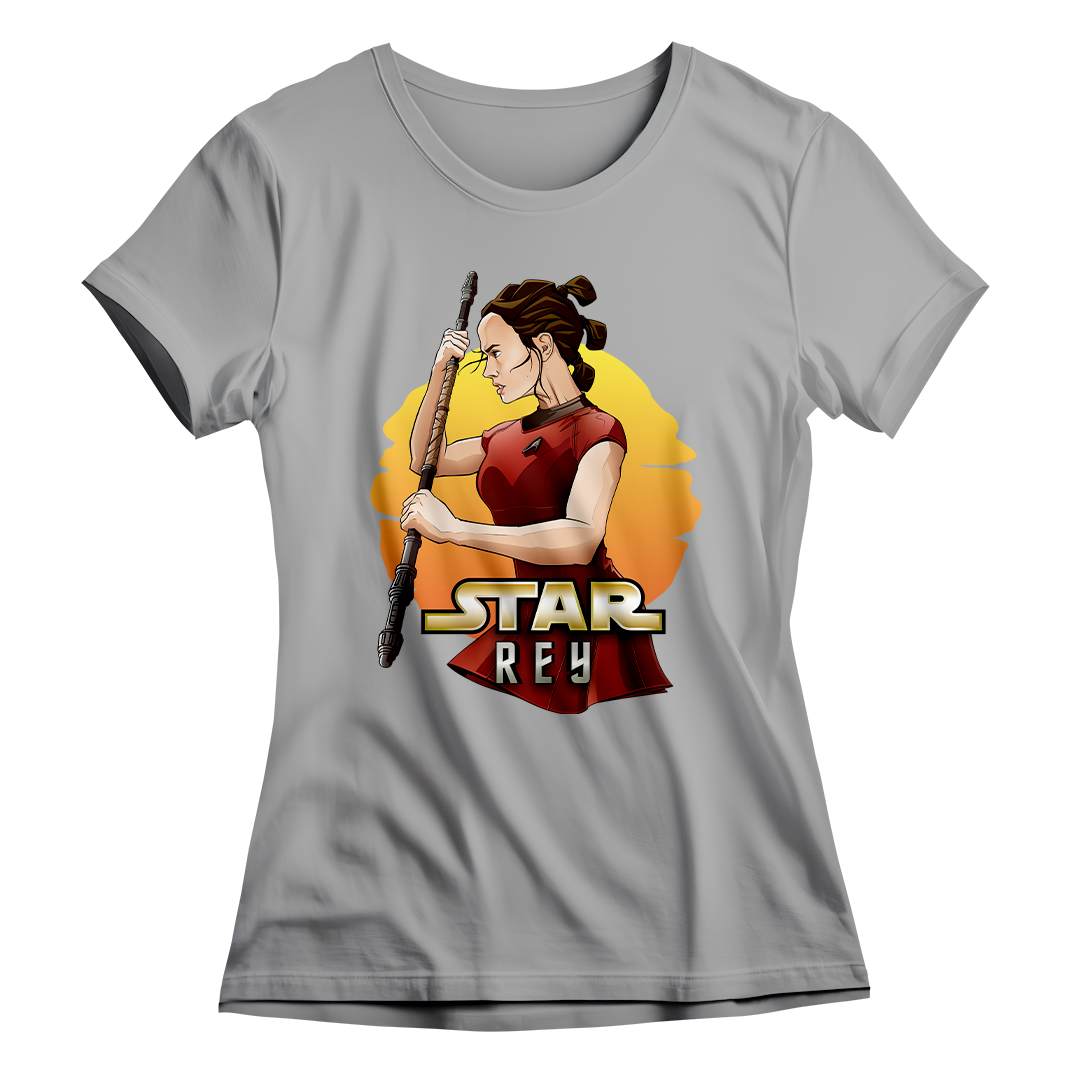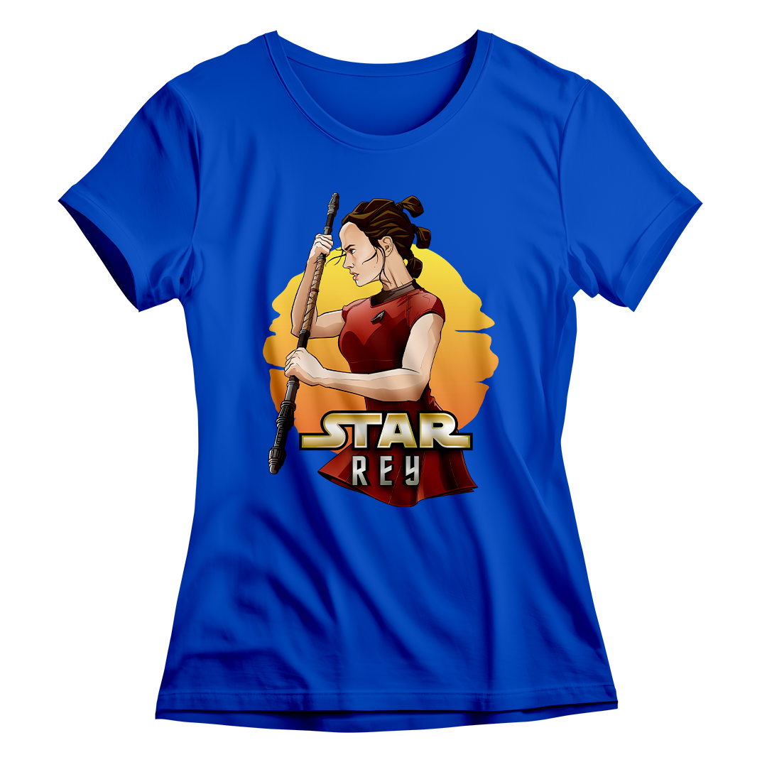 Na estampa 'Star Rey', mergulhamos fundo em um intrigante crossover que funde dois universos icônicos: Star Wars e Star Trek Além da Escuridão. O que torna essa criação verdadeiramente especial é a união de elementos tão distintos quanto a fantasia de Star Wars e a ficção científica de Star Trek. Nela, a protagonista Rey de Star Wars episódio 7 veste o uniforme de Uhura de Star Trek, desafiando as fronteiras dos gêneros. Esse crossover destemido e criativo celebra a paixão por ambos os mundos, provando que, na Geek Win, não há limites para a criatividade e a expressão de amor à cultura geek. O lettering 'Star Rey' incorpora a tipografia da franquia Star Wars em 'Star' e a tipografia de Star Trek em 'Rey', unindo visualmente os dois universos.