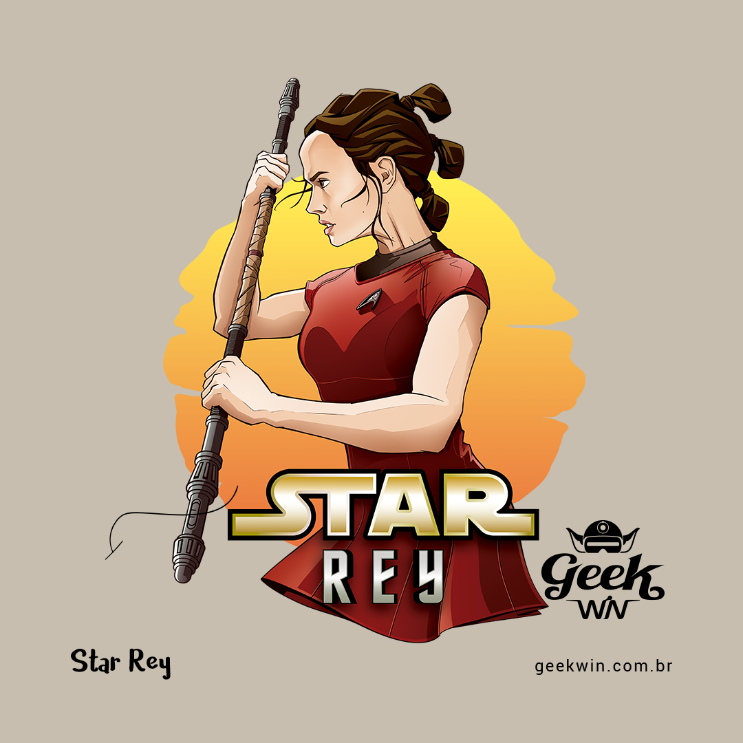 Na estampa 'Star Rey', mergulhamos fundo em um intrigante crossover que funde dois universos icônicos: Star Wars e Star Trek Além da Escuridão. O que torna essa criação verdadeiramente especial é a união de elementos tão distintos quanto a fantasia de Star Wars e a ficção científica de Star Trek. Nela, a protagonista Rey de Star Wars episódio 7 veste o uniforme de Uhura de Star Trek, desafiando as fronteiras dos gêneros. Esse crossover destemido e criativo celebra a paixão por ambos os mundos, provando que, na Geek Win, não há limites para a criatividade e a expressão de amor à cultura geek. O lettering 'Star Rey' incorpora a tipografia da franquia Star Wars em 'Star' e a tipografia de Star Trek em 'Rey', unindo visualmente os dois universos.