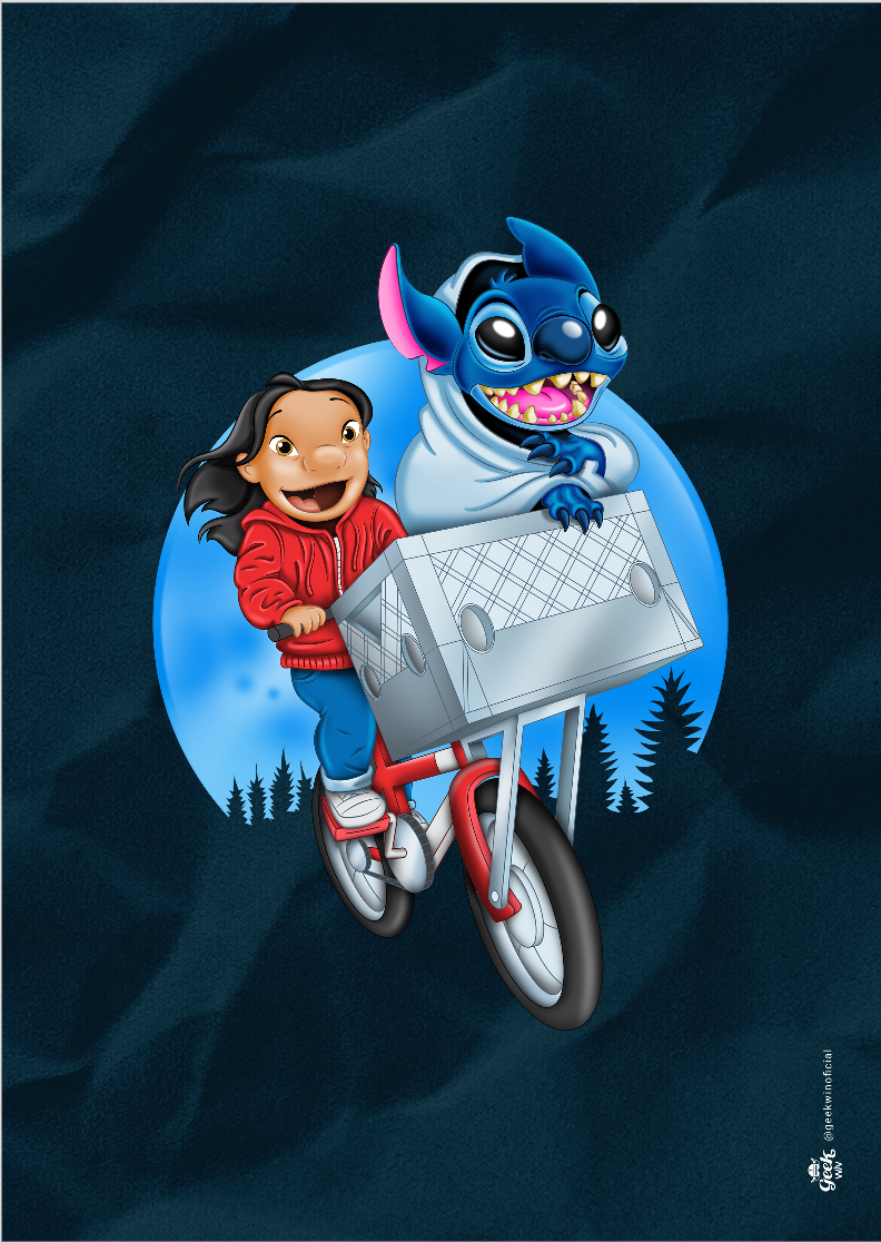 Prepare-se para uma viagem nostálgica e divertida com a estampa Stitch The Extra-Terrestrial! Inspirada no clássico filme E.T. – O Extraterrestre de Steven Spielberg e no inesquecível Lilo & Stitch da Disney, esta arte faz um crossover épico entre dois mundos amados da cultura pop. Na estampa, Lilo protagoniza a icônica cena da bicicleta voadora de E.T., mas ao invés do extraterrestre original, quem está na cesta é o caótico e adorável Stitch, também um alienígena! Tudo isso com o estilo visual encantador do desenho Lilo & Stitch.