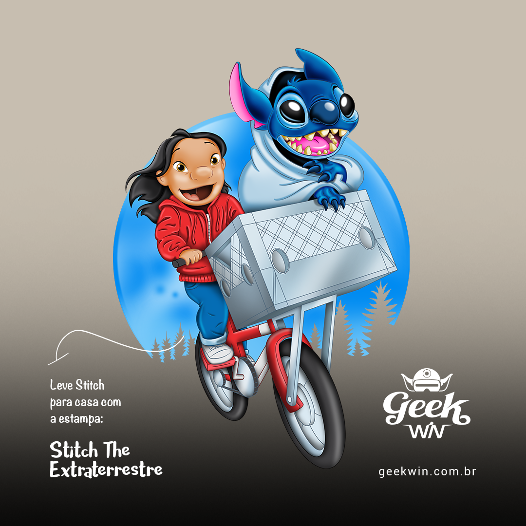 Prepare-se para uma viagem nostálgica e divertida com a estampa Stitch The Extra-Terrestrial! Inspirada no clássico filme E.T. – O Extraterrestre de Steven Spielberg e no inesquecível Lilo & Stitch da Disney, esta arte faz um crossover épico entre dois mundos amados da cultura pop. Na estampa, Lilo protagoniza a icônica cena da bicicleta voadora de E.T., mas ao invés do extraterrestre original, quem está na cesta é o caótico e adorável Stitch, também um alienígena! Tudo isso com o estilo visual encantador do desenho Lilo & Stitch.