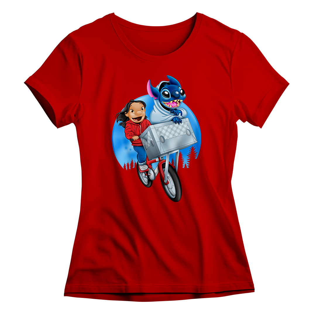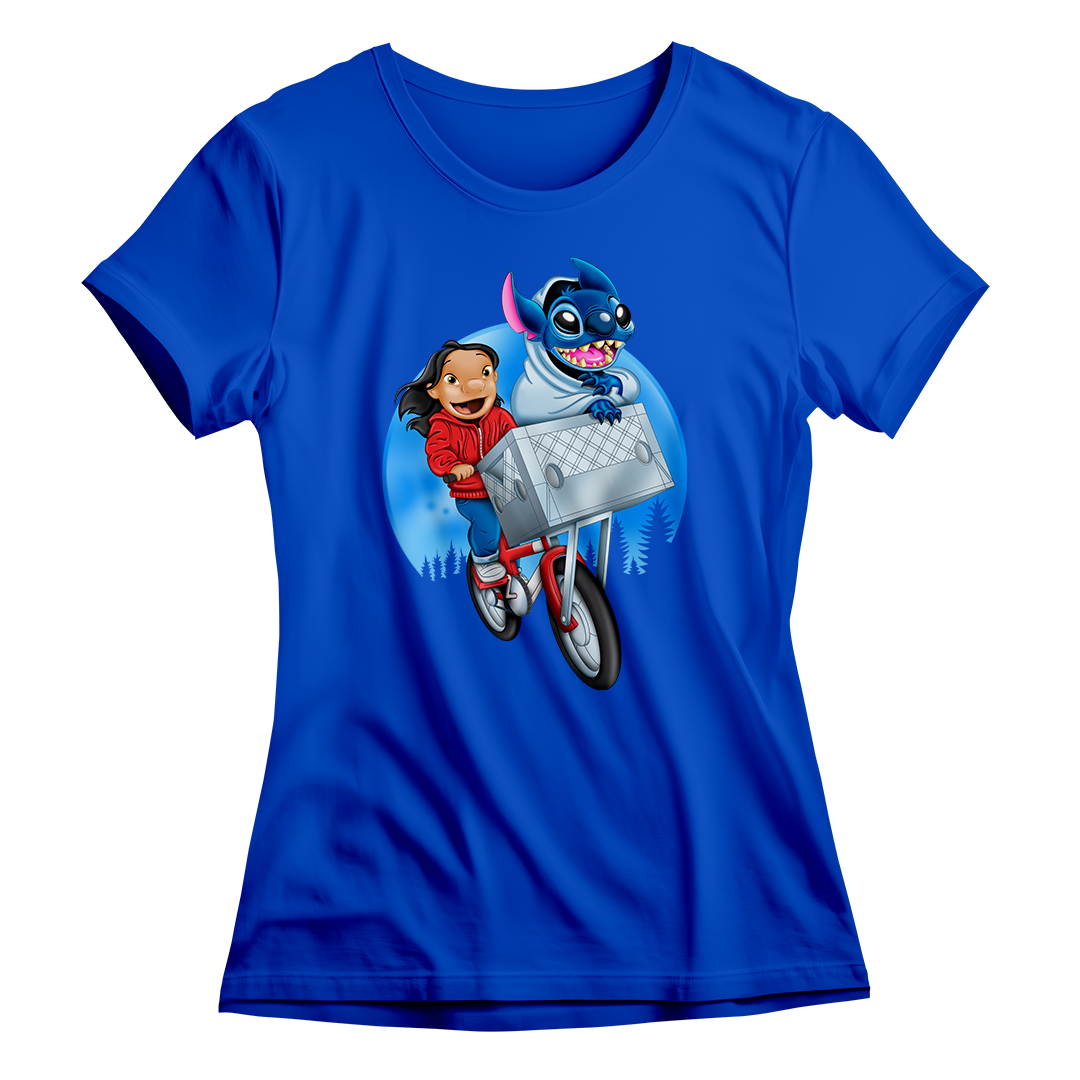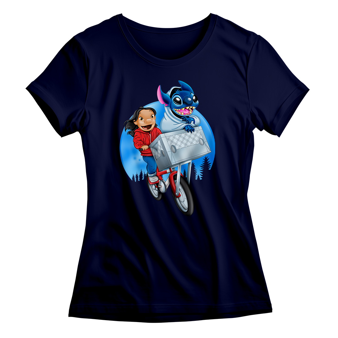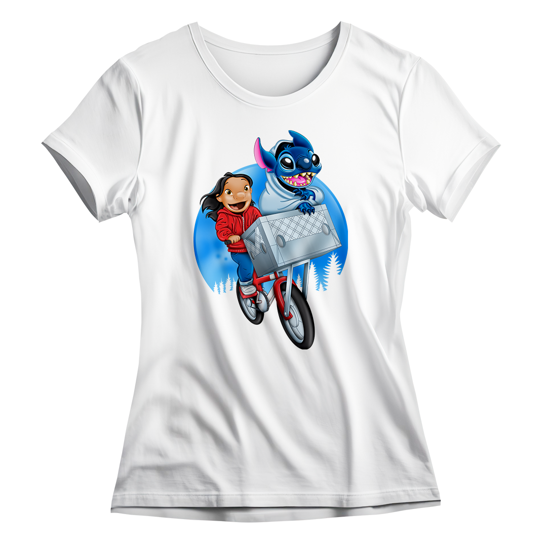 Prepare-se para uma viagem nostálgica e divertida com a estampa Stitch The Extra-Terrestrial! Inspirada no clássico filme E.T. – O Extraterrestre de Steven Spielberg e no inesquecível Lilo & Stitch da Disney, esta arte faz um crossover épico entre dois mundos amados da cultura pop. Na estampa, Lilo protagoniza a icônica cena da bicicleta voadora de E.T., mas ao invés do extraterrestre original, quem está na cesta é o caótico e adorável Stitch, também um alienígena! Tudo isso com o estilo visual encantador do desenho Lilo & Stitch.