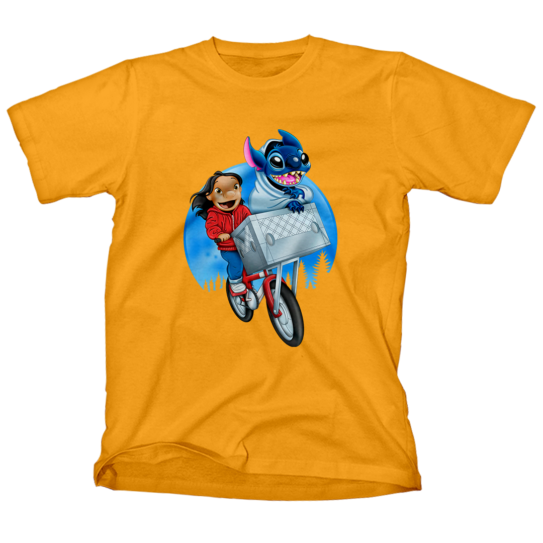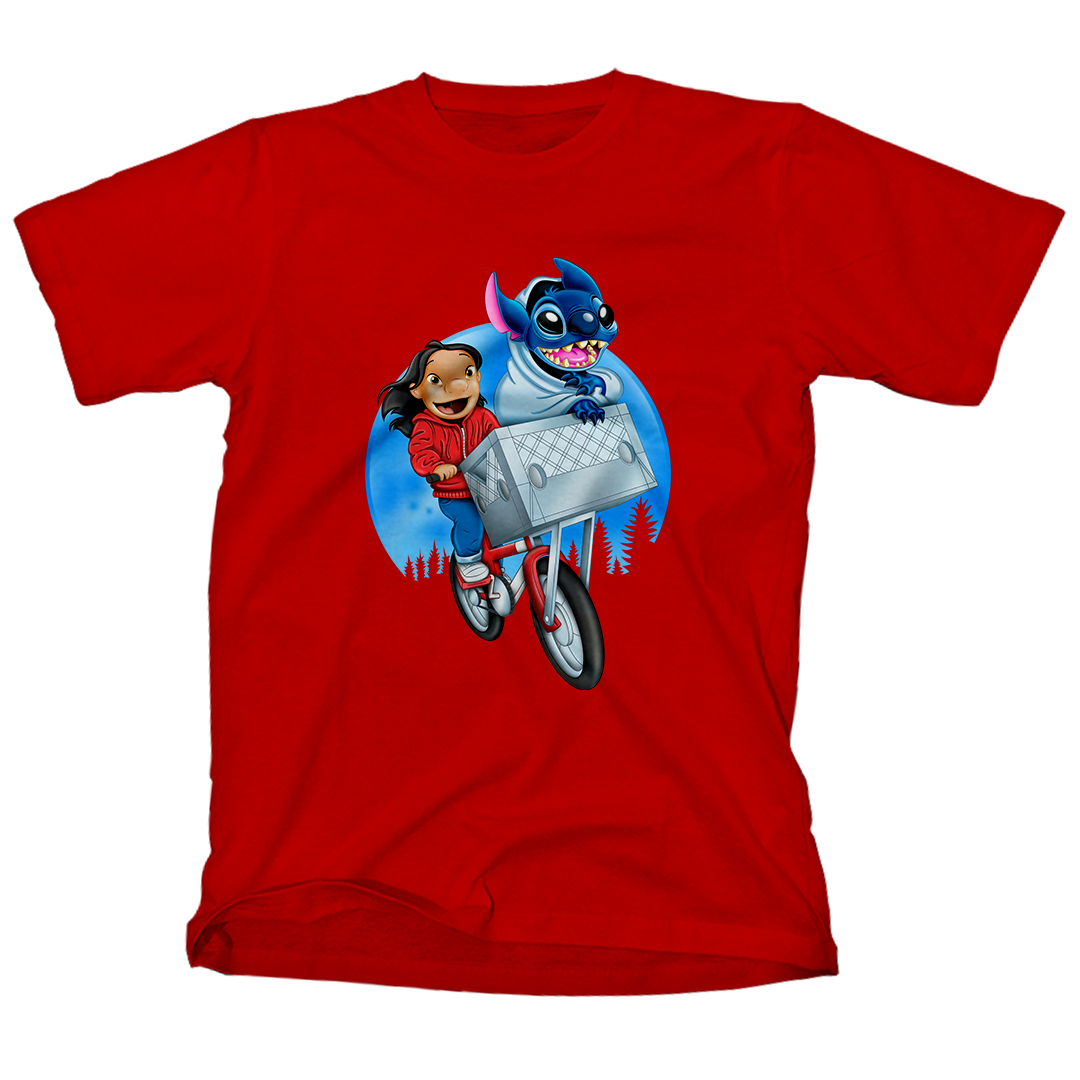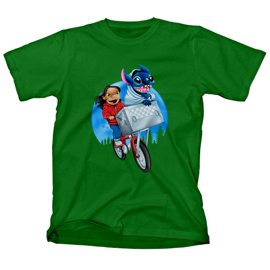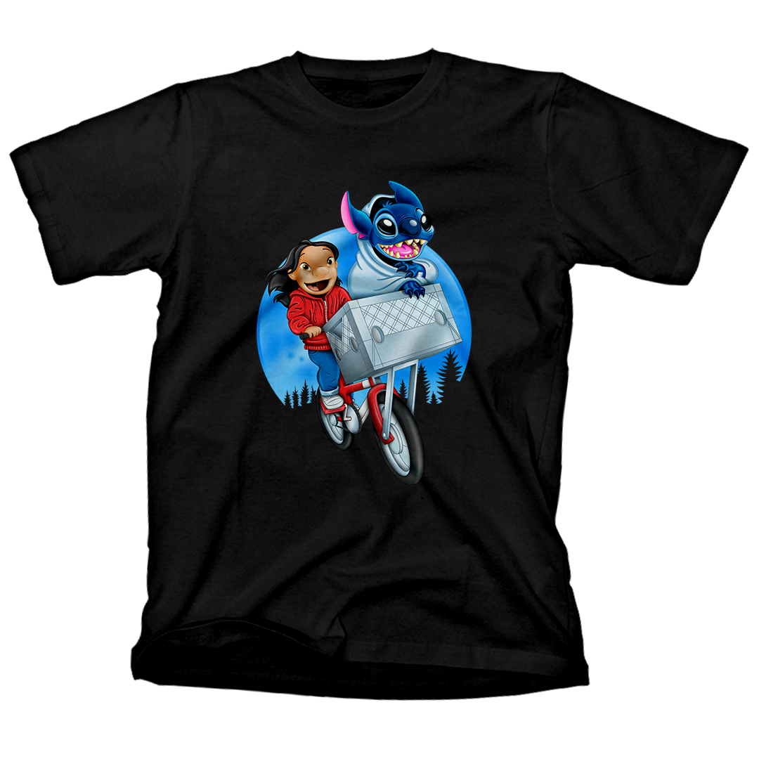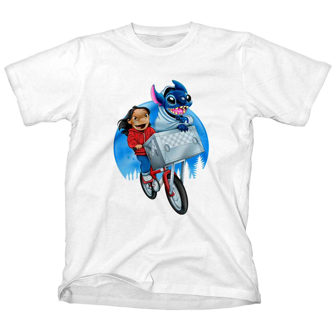 Prepare-se para uma viagem nostálgica e divertida com a estampa Stitch The Extra-Terrestrial! Inspirada no clássico filme E.T. – O Extraterrestre de Steven Spielberg e no inesquecível Lilo & Stitch da Disney, esta arte faz um crossover épico entre dois mundos amados da cultura pop. Na estampa, Lilo protagoniza a icônica cena da bicicleta voadora de E.T., mas ao invés do extraterrestre original, quem está na cesta é o caótico e adorável Stitch, também um alienígena! Tudo isso com o estilo visual encantador do desenho Lilo & Stitch.