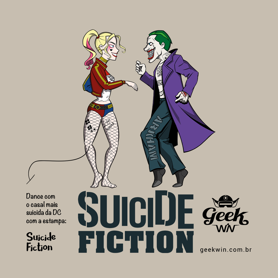 Explore o encontro único entre o universo do Suicide Squad da DC e o estilo icônico de Quentin Tarantino em nossa estampa "Suicide Fiction". Testemunhe o casal explosivo Arlequina e Coringa recriando, com sua própria dose de loucura, a inesquecível cena de dança de Mia e Vincent do Pulp Fiction. Uma fusão de referências cinematográficas que eleva o estilo geek a um novo patamar. Adquira essa mistura única de cultura pop agora! #SuicideFiction #CrossoverCinematografico #EstampaGeek #QuentinTarantinoInspired #EsquadrãoSuicida #PulpFictionMeme #CasalNerd #ArlequinaCoringa #CamisetaCinéfila #ModaGeek #DançaCinematográfica #DCComicsInspired #TarantinoStyle #NerdFashion