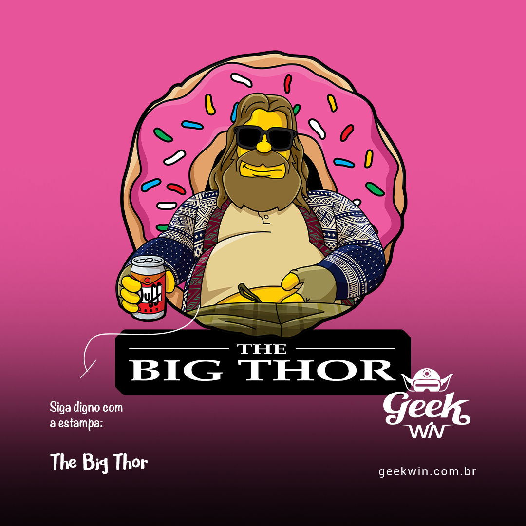 Quem disse que super-heróis não podem relaxar? Em 'The Big Thor', nossa homenagem a Avengers: Endgame encontra o universo de Os Simpsons. Fat Thor, com inspiração no icônico Lebowski, aproveita uma Duff gelada na frente de um Donut gigante. Uma mistura épica de humor e referências que você só encontra na Geek Win. #TheBigThor #GeekWinStyle #SimpsonsMeetsMarvel #UltimateCrossover