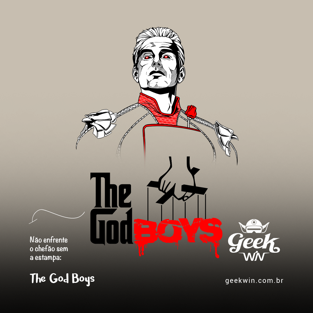 Entre no universo crossover de "The God Boys", onde Capitão Pátria (Homelander) assume o papel icônico de Don Corleone em uma homenagem criativa que mistura The Boys com O Poderoso Chefão. Nesta estampa exclusiva da Geek Win, veja Capitão Pátria com seus olhos vermelhos penetrantes e a clássica rosa-vermelha presa ao seu uniforme, lembrando o icônico elemento do terno de Don Corleone.