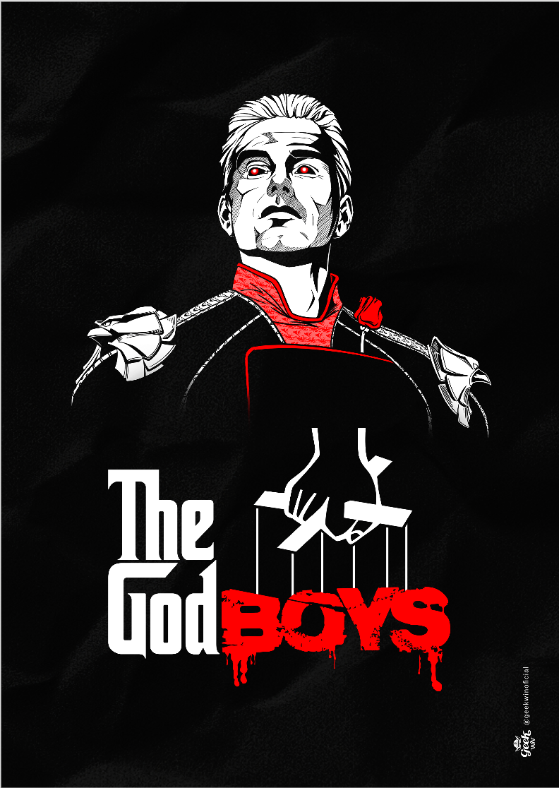 Entre no universo crossover de "The God Boys", onde Capitão Pátria (Homelander) assume o papel icônico de Don Corleone em uma homenagem criativa que mistura The Boys com O Poderoso Chefão. Nesta estampa exclusiva da Geek Win, veja Capitão Pátria com seus olhos vermelhos penetrantes e a clássica rosa-vermelha presa ao seu uniforme, lembrando o icônico elemento do terno de Don Corleone.