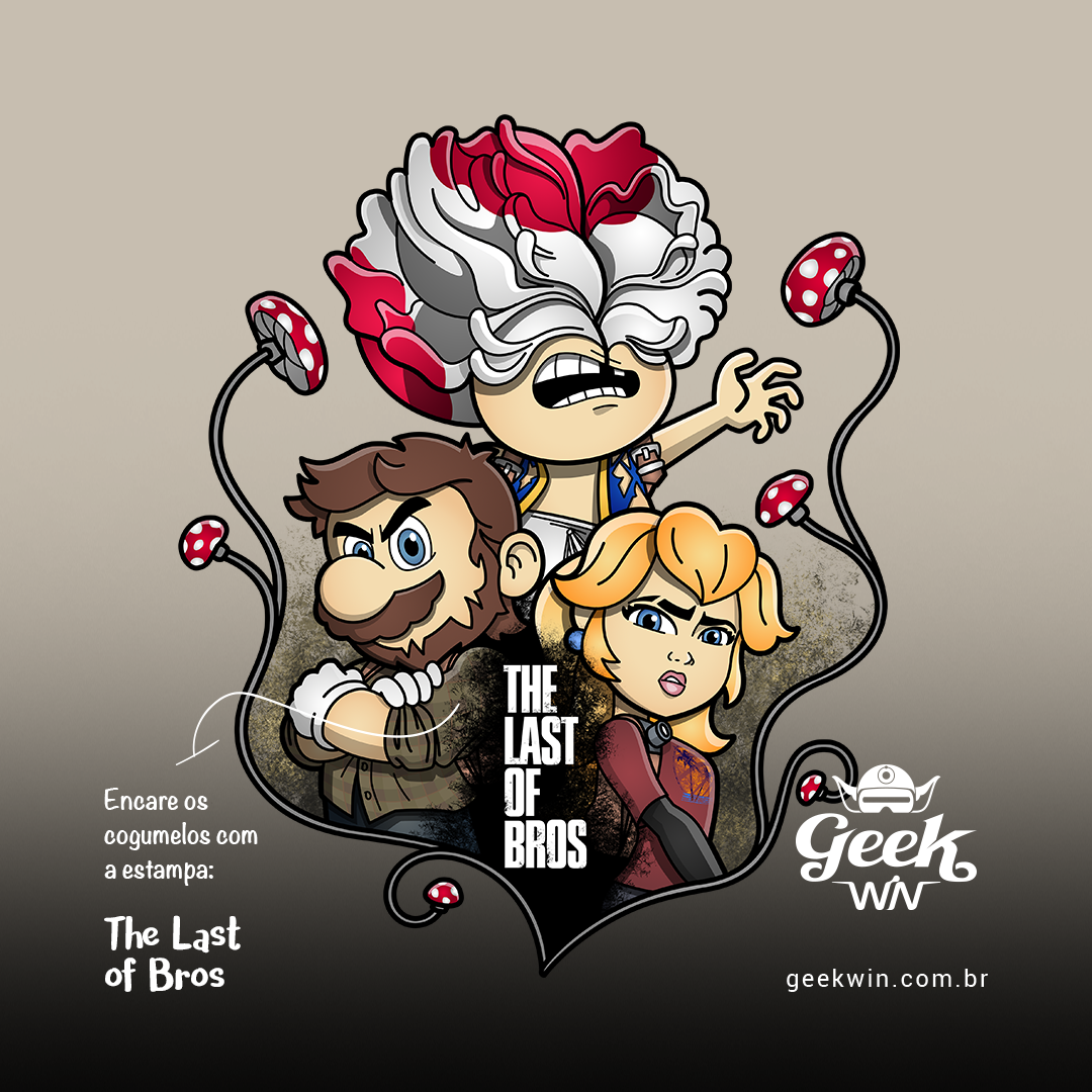 Explore um mundo onde cogumelos não são apenas itens de poder, mas também uma terrível ameaça. Em nossa estampa "The Last of Bros", mergulhe na fusão única entre The Last of Us e Super Mário Bros. Testemunhe Toad, agora transformado em um Clicker, expressando desespero e zumbificação. A baixo, Mario assume o papel de Joel, protegendo a Princesa Peach, que personifica a corajosa Ellie. Os cogumelos crescem entre esses personagens, contornando a narrativa de sobrevivência. O lettering "The Last of Bros" evoca a união desses dois universos, onde Mario se torna o último dos irmãos em uma jornada épica. Envolva-se nesta mistura única de ação, aventura e cogumelos, uma exclusividade Geek Win.