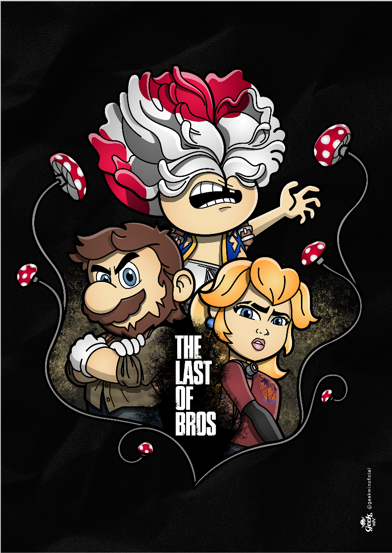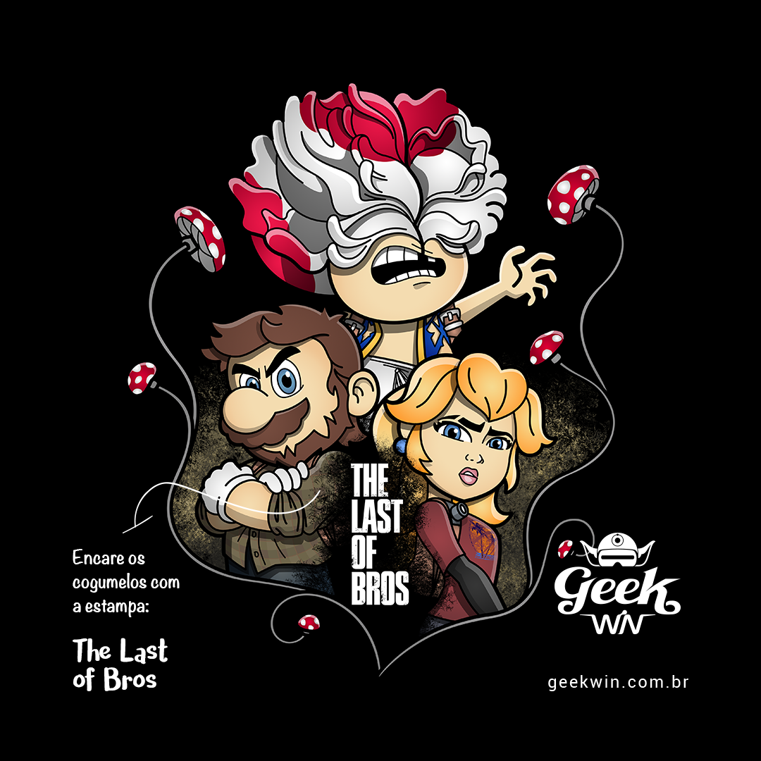 Explore um mundo onde cogumelos não são apenas itens de poder, mas também uma terrível ameaça. Em nossa estampa "The Last of Bros", mergulhe na fusão única entre The Last of Us e Super Mário Bros. Testemunhe Toad, agora transformado em um Clicker, expressando desespero e zumbificação. A baixo, Mario assume o papel de Joel, protegendo a Princesa Peach, que personifica a corajosa Ellie. Os cogumelos crescem entre esses personagens, contornando a narrativa de sobrevivência. O lettering "The Last of Bros" evoca a união desses dois universos, onde Mario se torna o último dos irmãos em uma jornada épica. Envolva-se nesta mistura única de ação, aventura e cogumelos, uma exclusividade Geek Win.