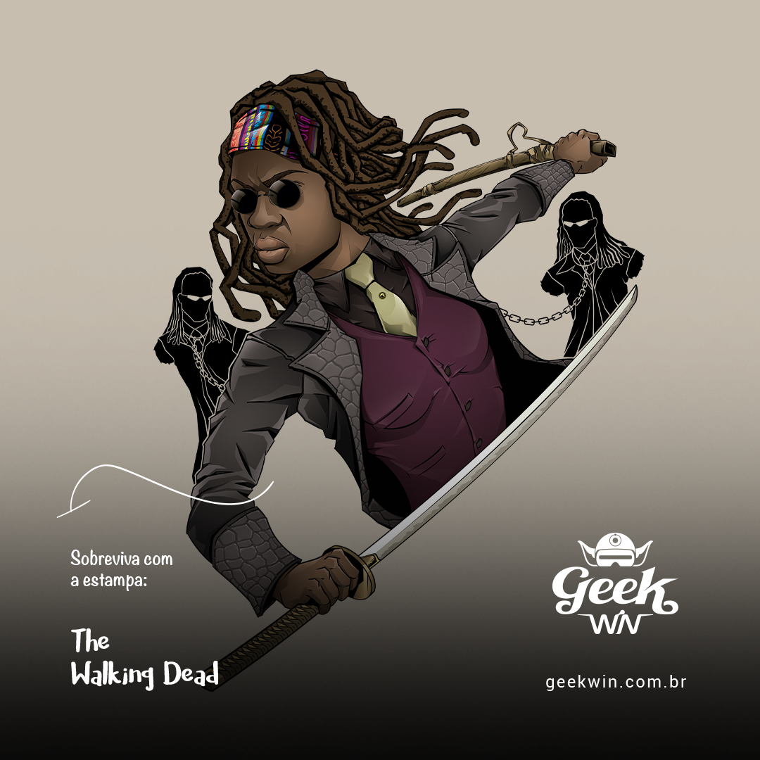 Adentre o universo sombrio e envolvente com a estampa "The Walking Dead". Nesse intrigante crossover entre a série épica de zumbis e o icônico filme "Matrix Reloaded", Michonne assume o papel de Morpheus em uma cena memorável. Empunhando sua espada com destreza, ela enfrenta os Gêmeos de Matrix, que agora assumem a forma de zumbis acorrentados. Uma fusão única de dois mundos intensos que promete um visual marcante e cheio de referências. Explore essa união extraordinária entre o apocalipse zumbi e a realidade virtual com a moda geek que transcende as fronteiras dos gêneros.