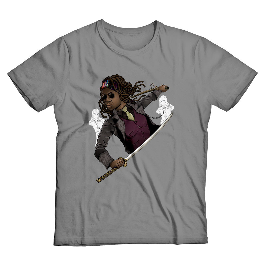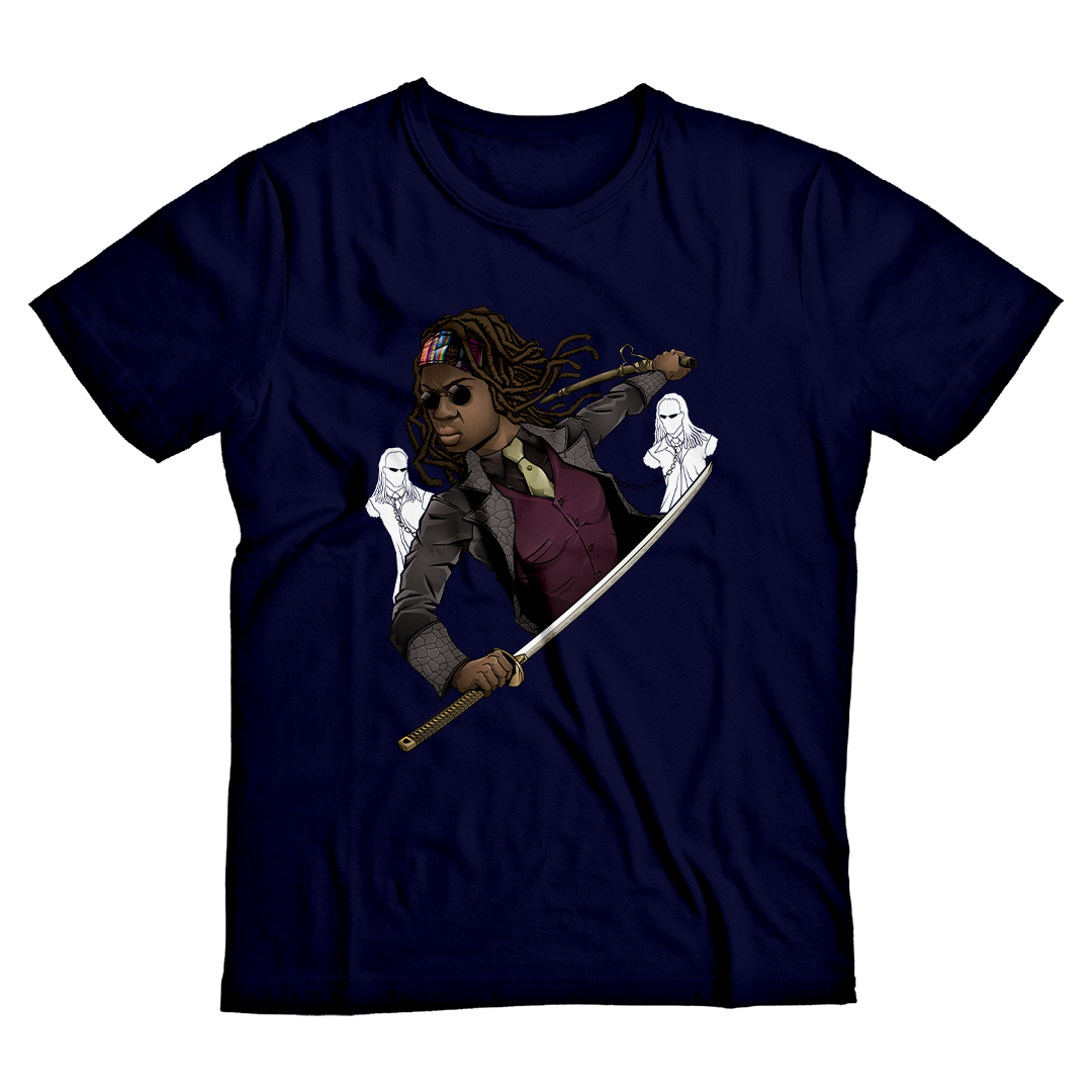 Adentre o universo sombrio e envolvente com a estampa "The Walking Dead". Nesse intrigante crossover entre a série épica de zumbis e o icônico filme "Matrix Reloaded", Michonne assume o papel de Morpheus em uma cena memorável. Empunhando sua espada com destreza, ela enfrenta os Gêmeos de Matrix, que agora assumem a forma de zumbis acorrentados. Uma fusão única de dois mundos intensos que promete um visual marcante e cheio de referências. Explore essa união extraordinária entre o apocalipse zumbi e a realidade virtual com a moda geek que transcende as fronteiras dos gêneros.